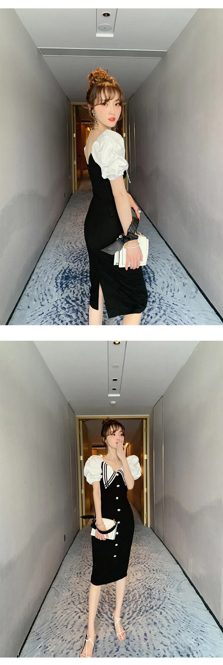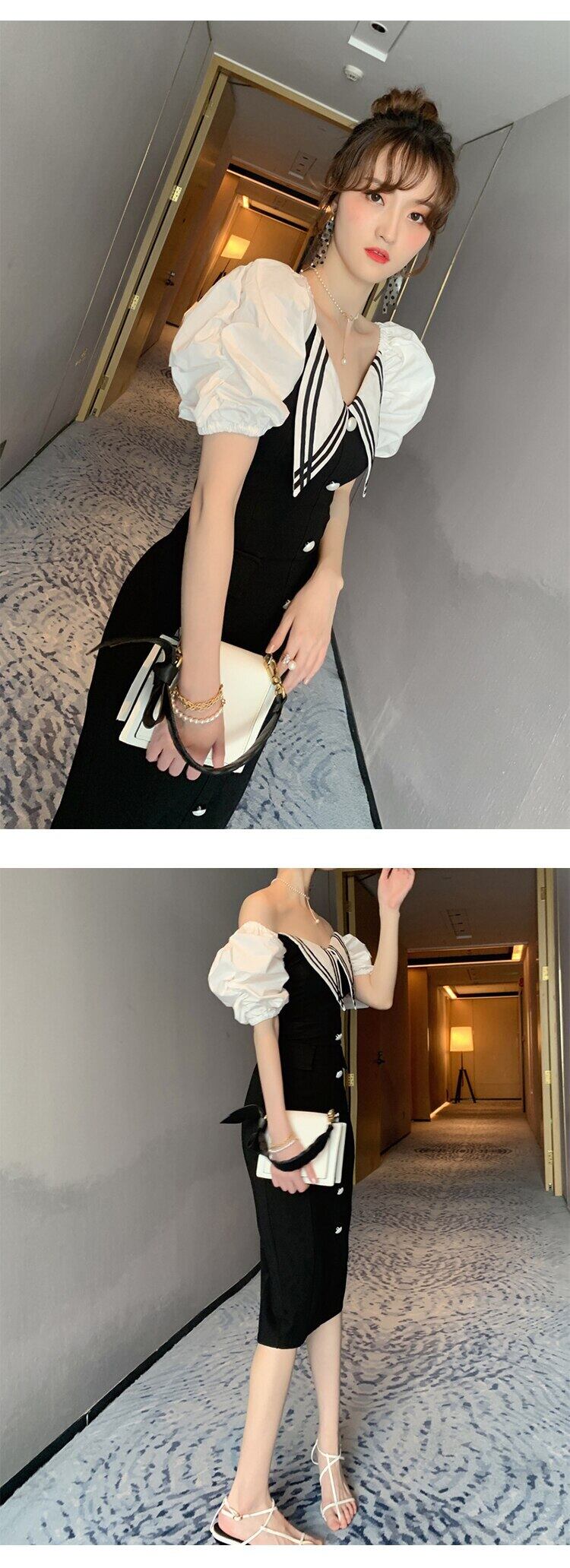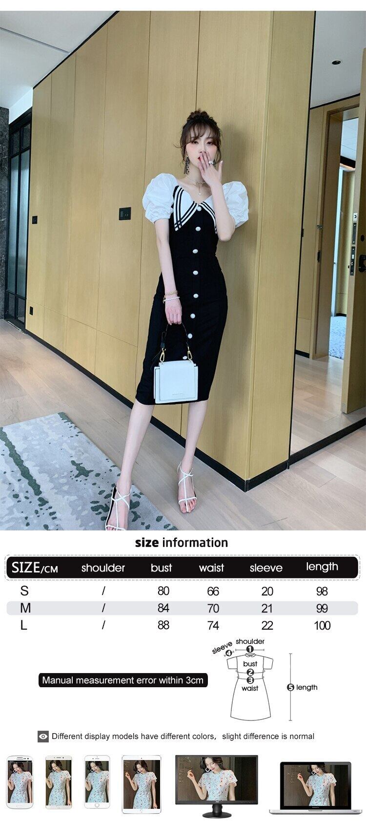 新着韓国スタイルファッションボディコンドレス女性エレガントな夏のパフスリーブヴィンテージ気質パーティー黒ペンシルドレス ブラック サマー 夏物 ビンテージ