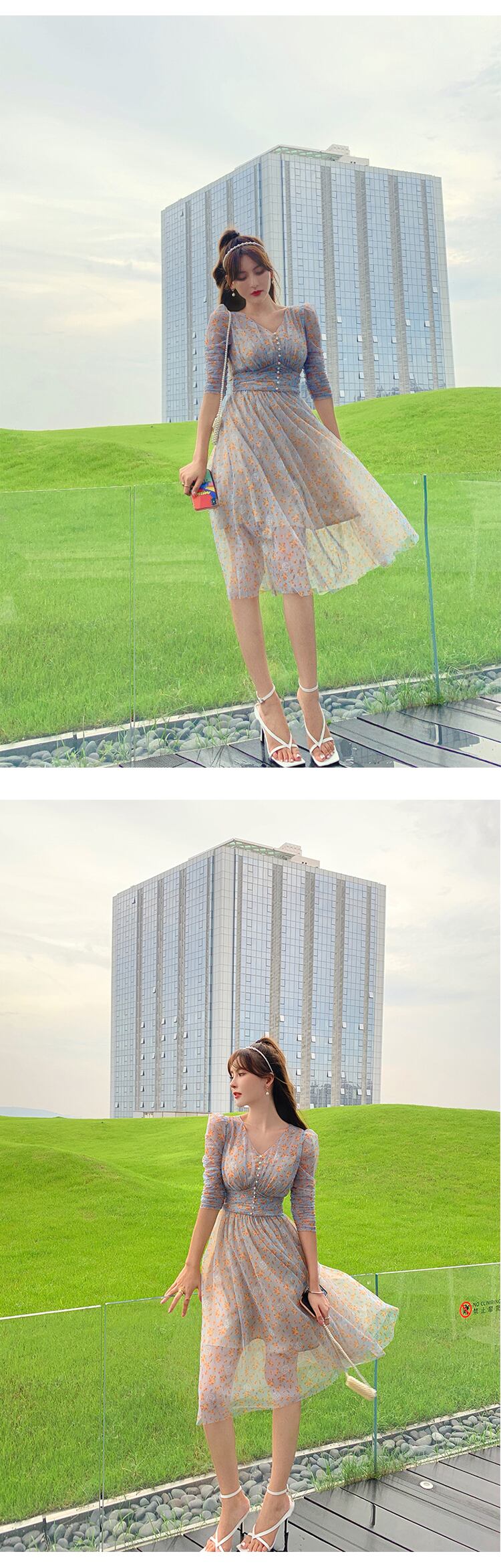 新着ファッション春ミディ ビーチ女性 OL 気質エレガントなシフォン フラワー プリント透視真珠スリム ホリデー ドレス スプリング 春物 パール フラワーデザイン