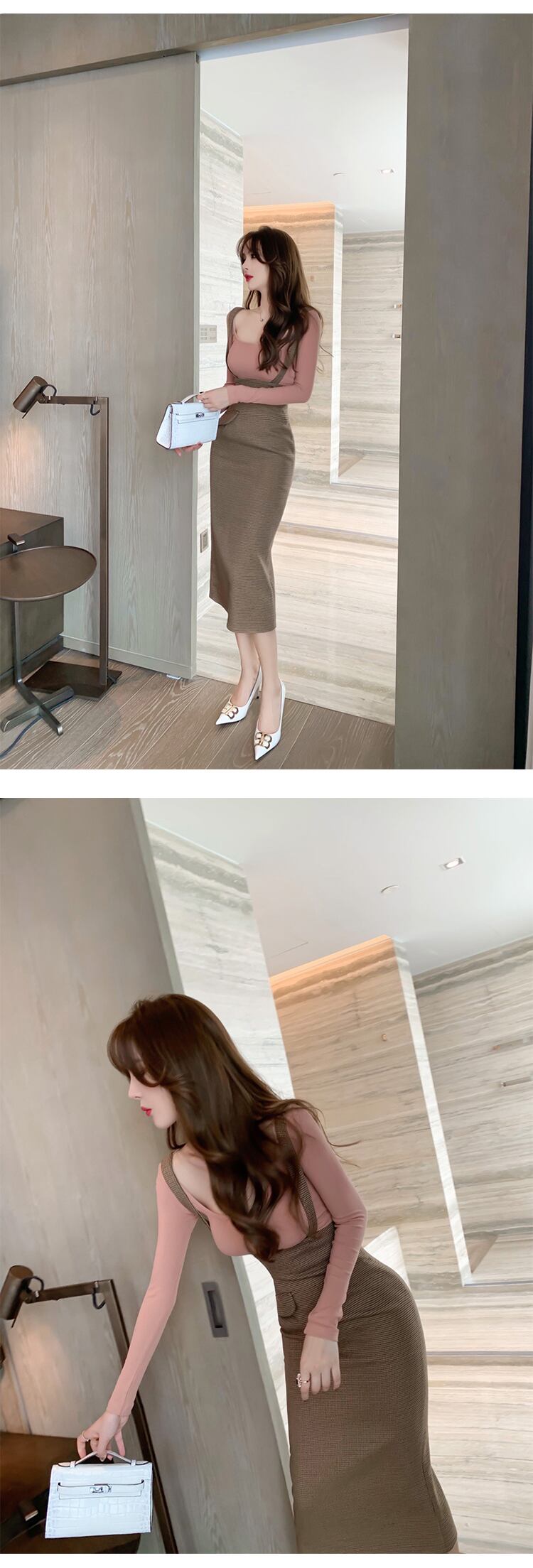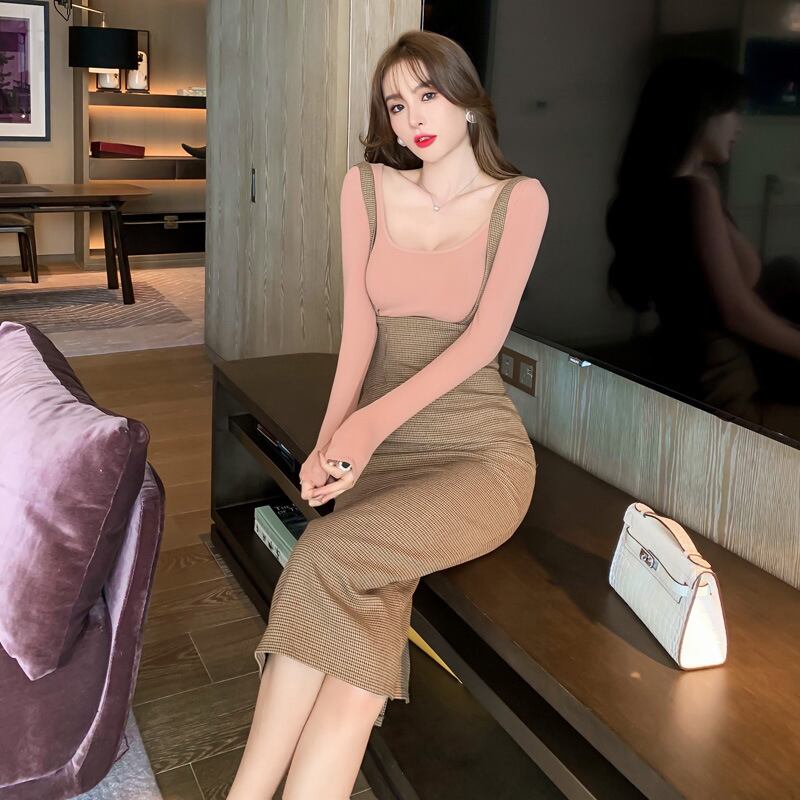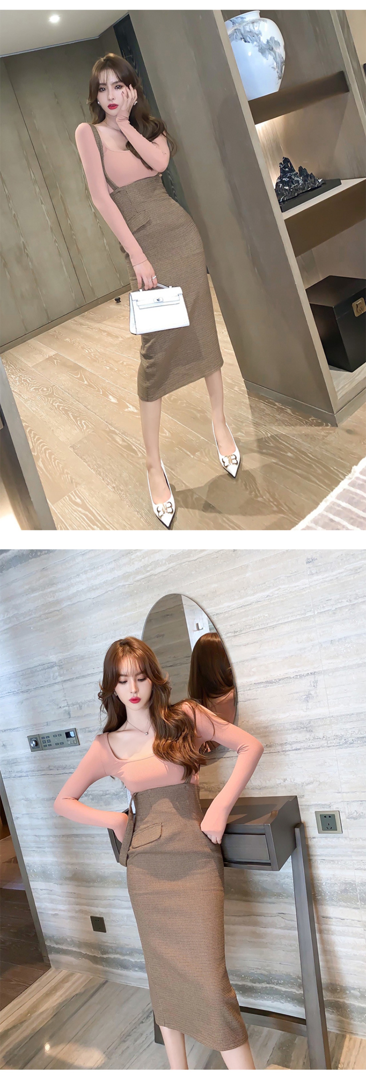 新着ファッション韓国春スリム セット女性 OL プロフェッショナル甘い t シャツ ピンクと格子縞のストラップ ミディ スカート 2 点セット 大人ガーリー スウィート キュート カジュアル スプリング 春物 Tシャツ