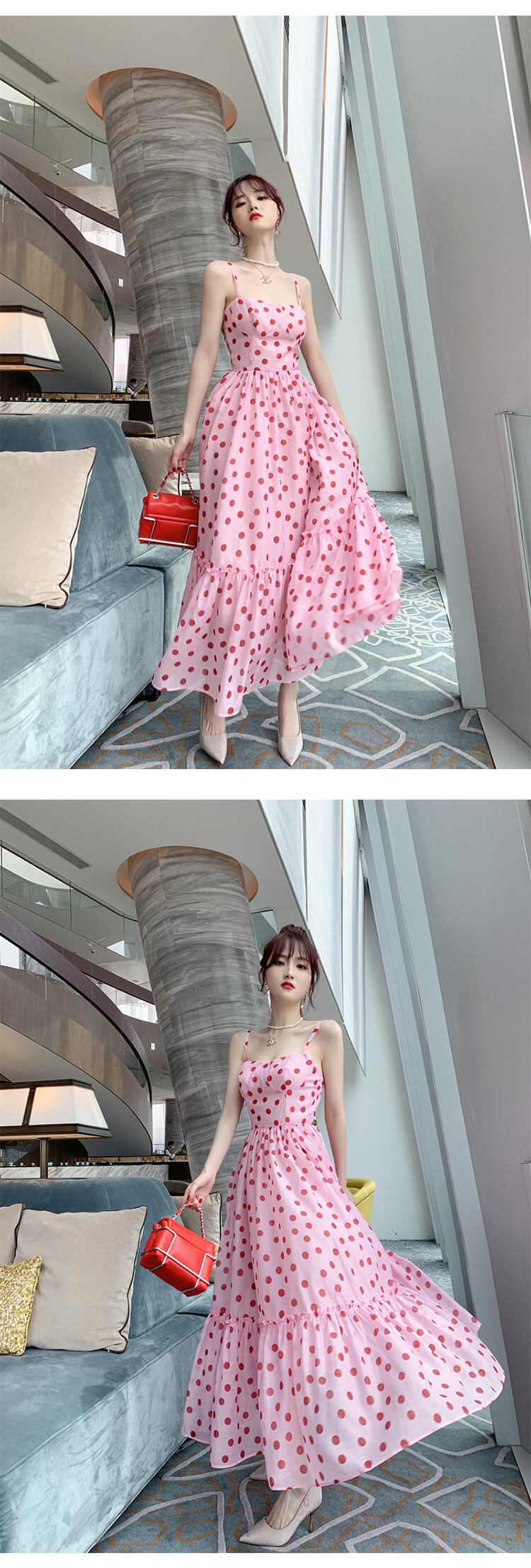 新着ファッションパーティードレス女性エレガントな夏のセクシーなストラップ甘いピンクドット気質オフィスレディシフォンロング a ラインドレス 大人ガーリー スウィート キュート カジュアル サマー 夏物 Aライン 会社 学校 通勤や通学にも