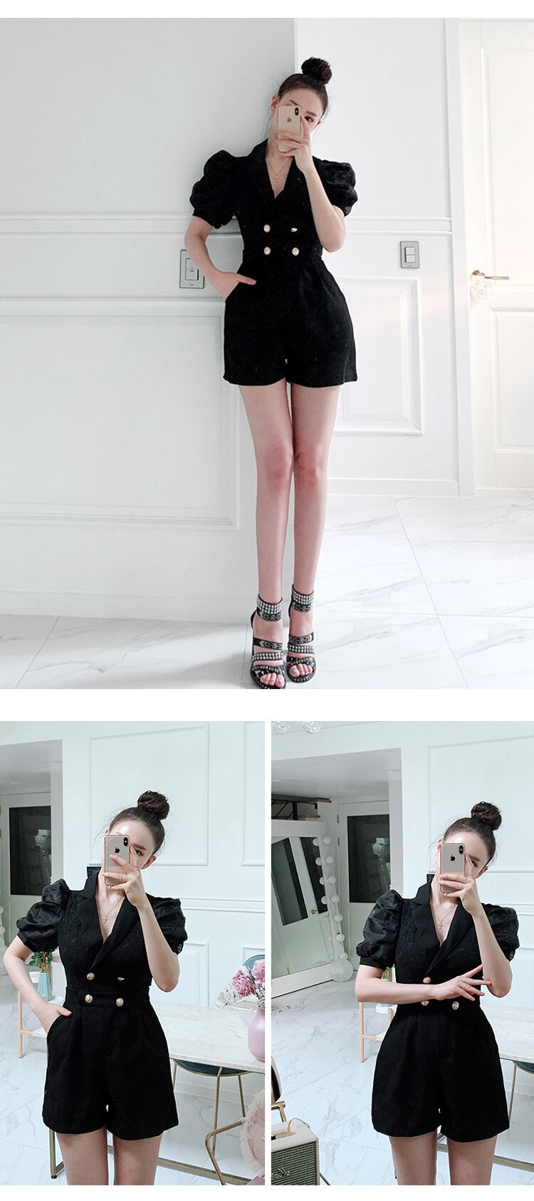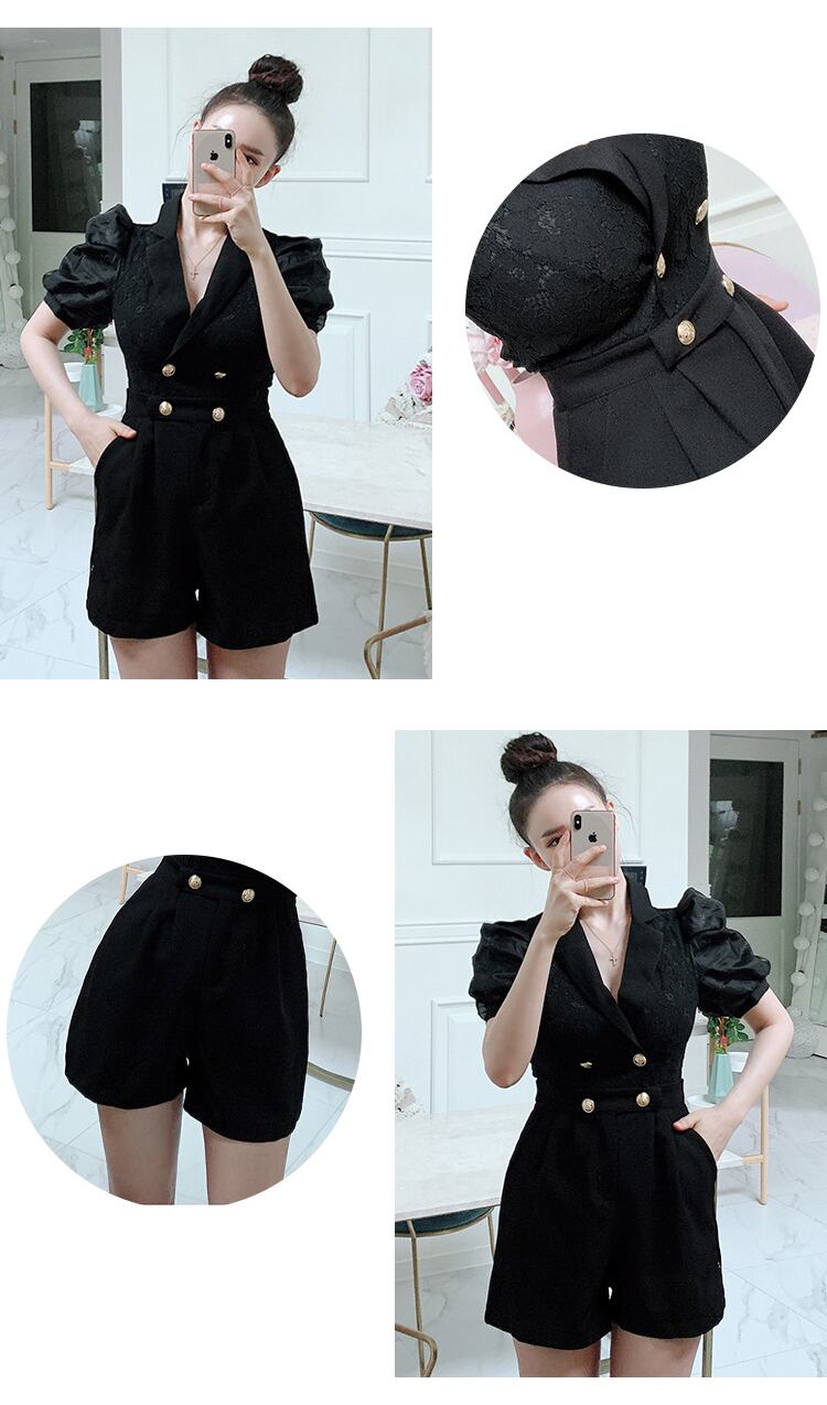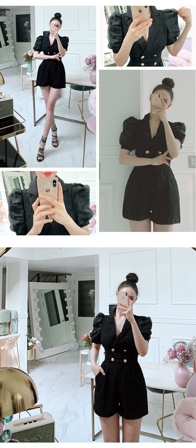 新着ファッション夏ジャンプスーツ女性エレガントなレースヴィンテージパフスリーブオフィスレディ気質スリム黒ショートジャンプスーツ ブラック サマー 夏物 ビンテージ 会社 学校 通勤や通学にも