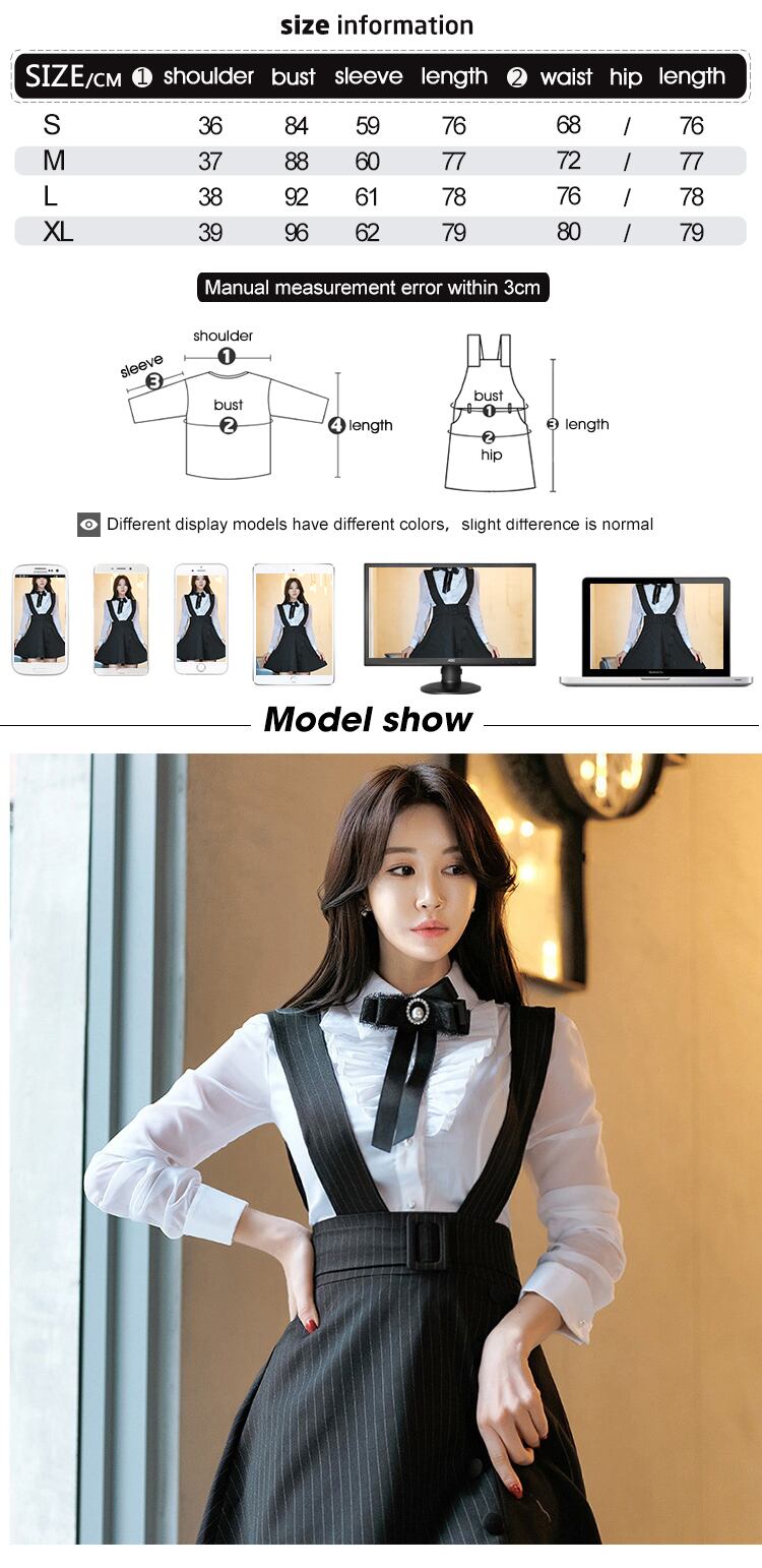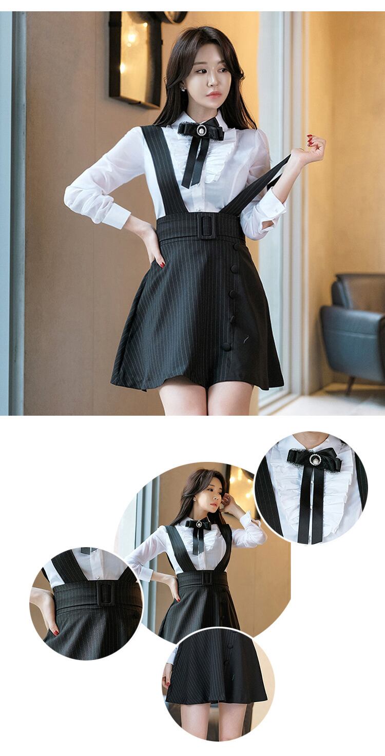 新着ファッションセット女性春 OL ヤング カジュアル レディース長袖フリル ボウ白シャツとストライプ ドレス 2 点セット ロング ホワイト リボン スプリング 春物