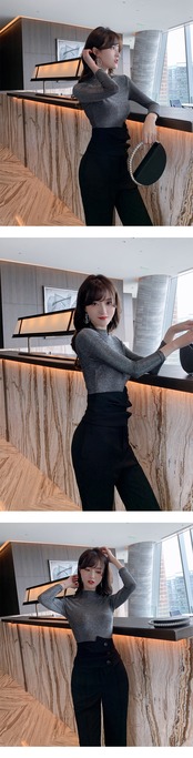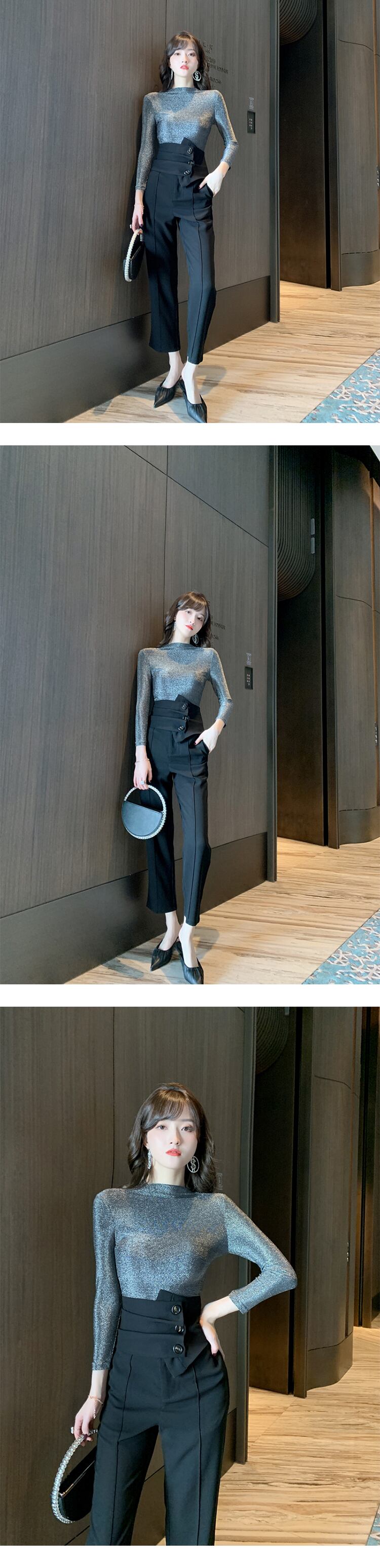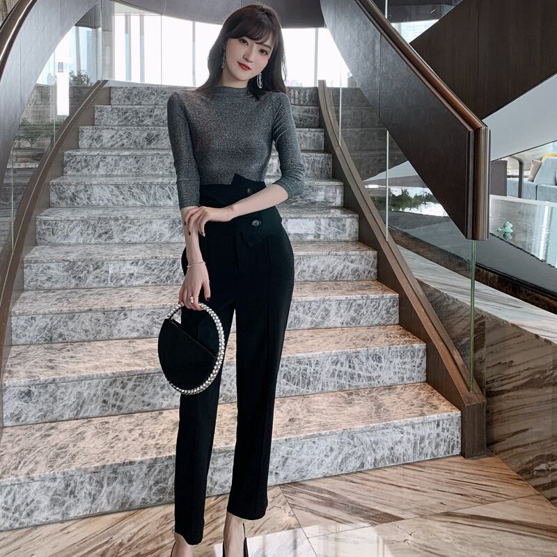 新着オフィスレディファッション女性セットシャイニングスリム t シャツとロングブラックパンツ気質エレガントな 2 ピース女性セット Tシャツ 会社 学校 通勤や通学にも