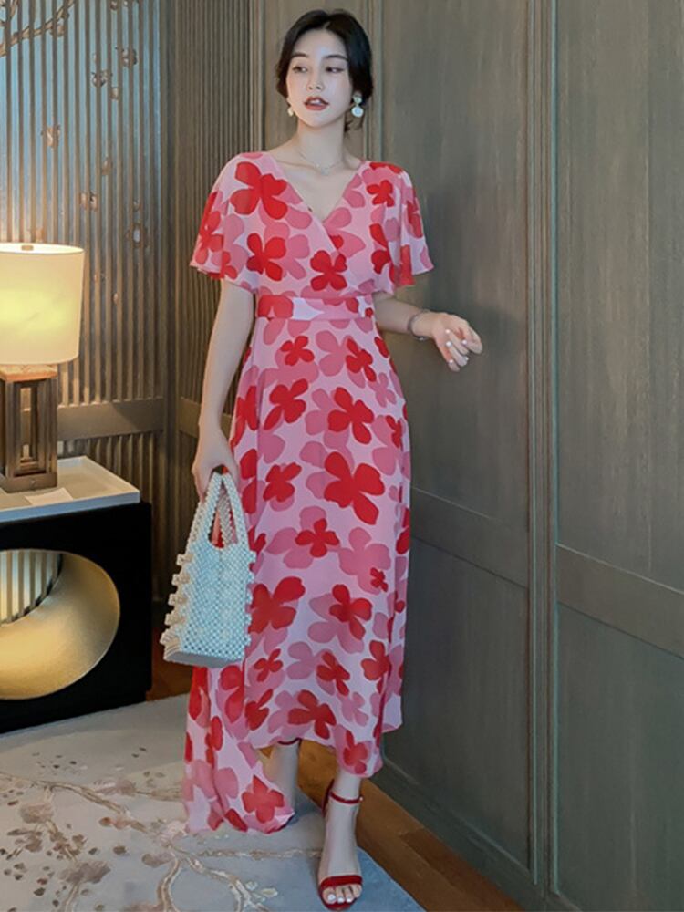女性新着シフォン プリントかわいいロング ドレス カジュアル ヴィンテージ夏 v ネック a ライン ドレス 大人ガーリー スウィート キュート サマー 夏物 Vネック Aライン ビンテージ