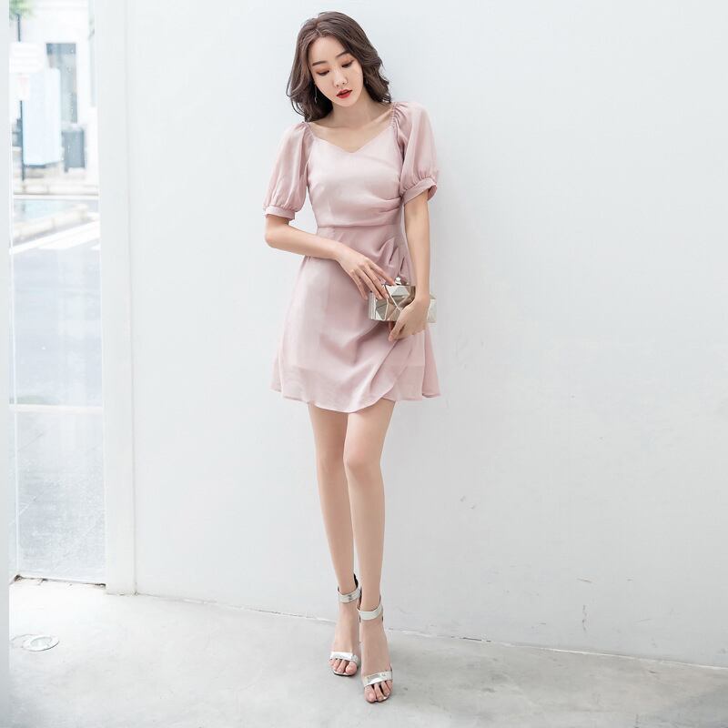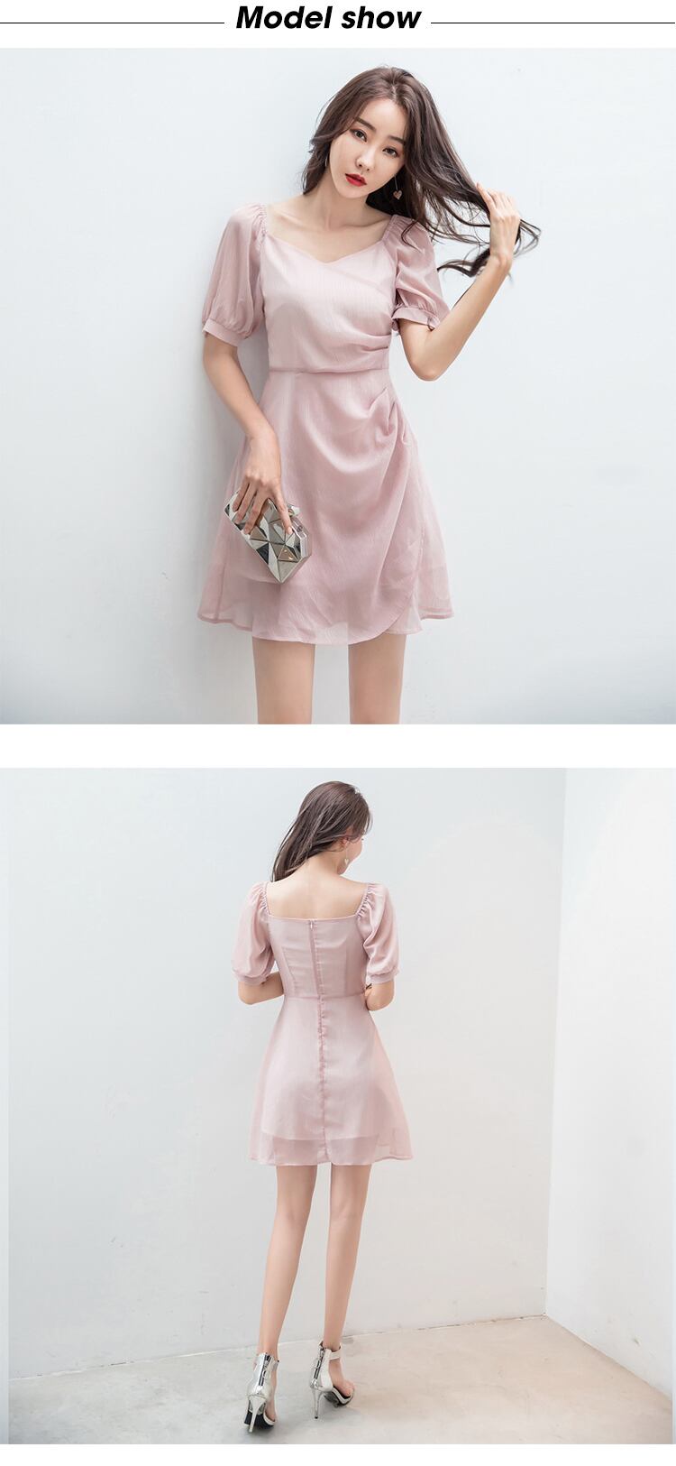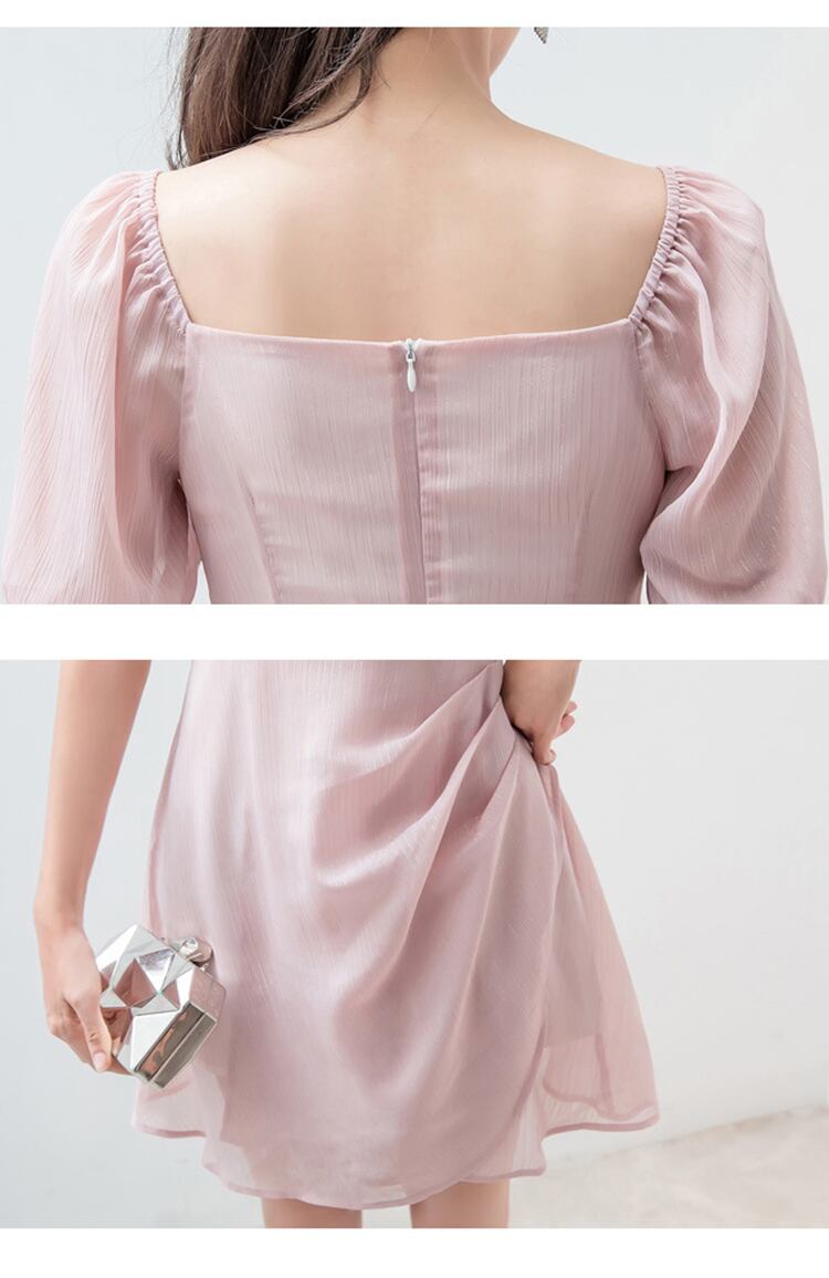 新着ファッション シフォン ドレス女性エレガントな夏ヴィンテージ スクエア カラー気質シンプル スリム新鮮なピンク a ライン ドレス サマー 夏物 Aライン スクウェア ビンテージ