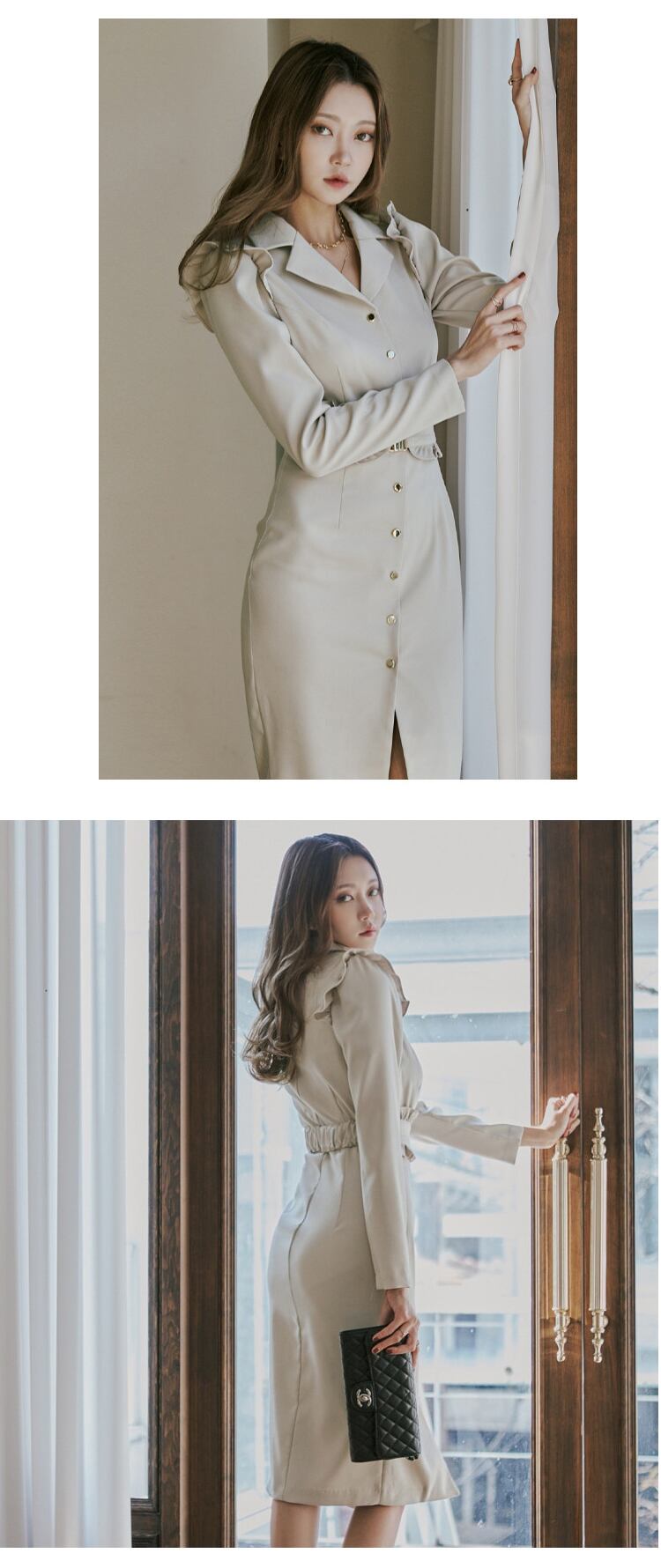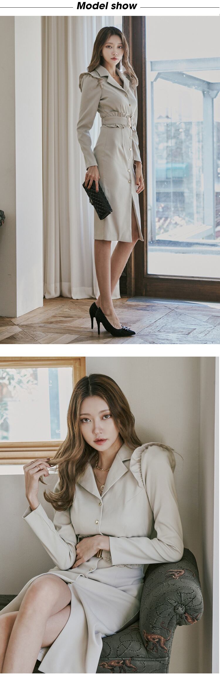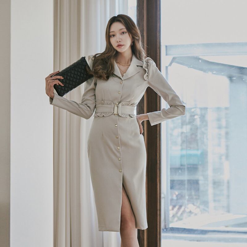 新着ファッション春ミディドレス女性 OL 気質プロフェッショナルレディース長袖フリルベルトスプリットスリムブレザードレス ロング スプリング 春物 ハーネス