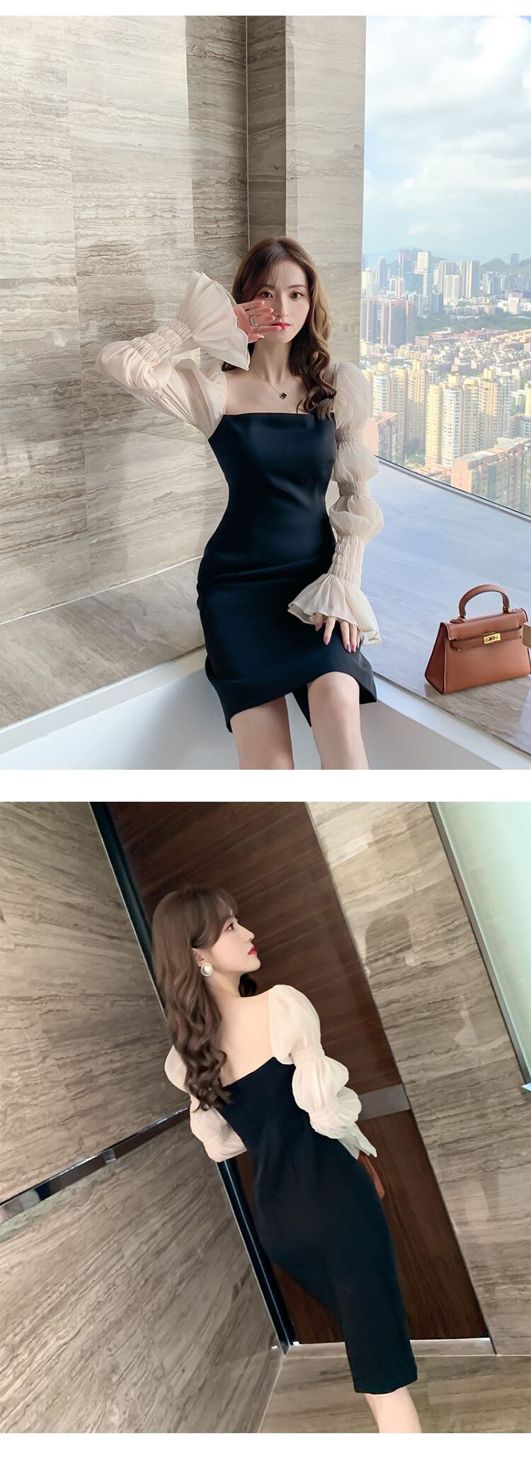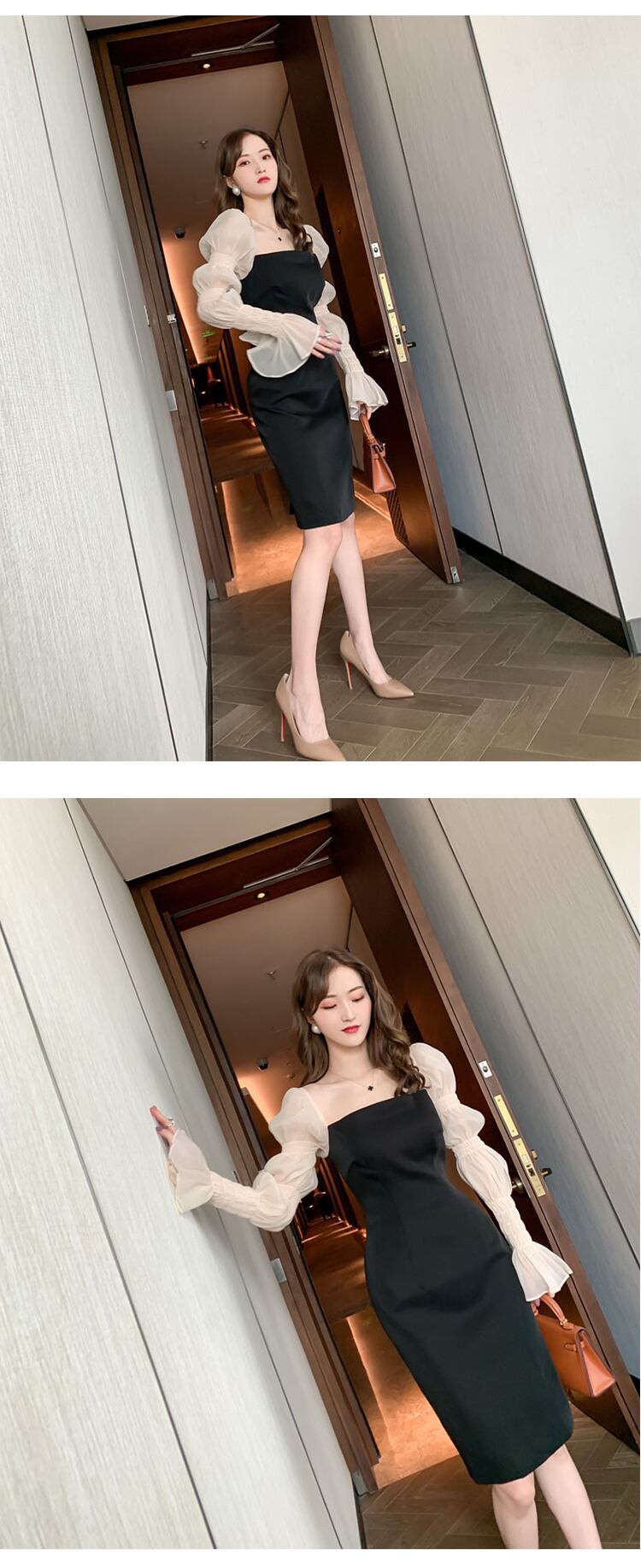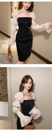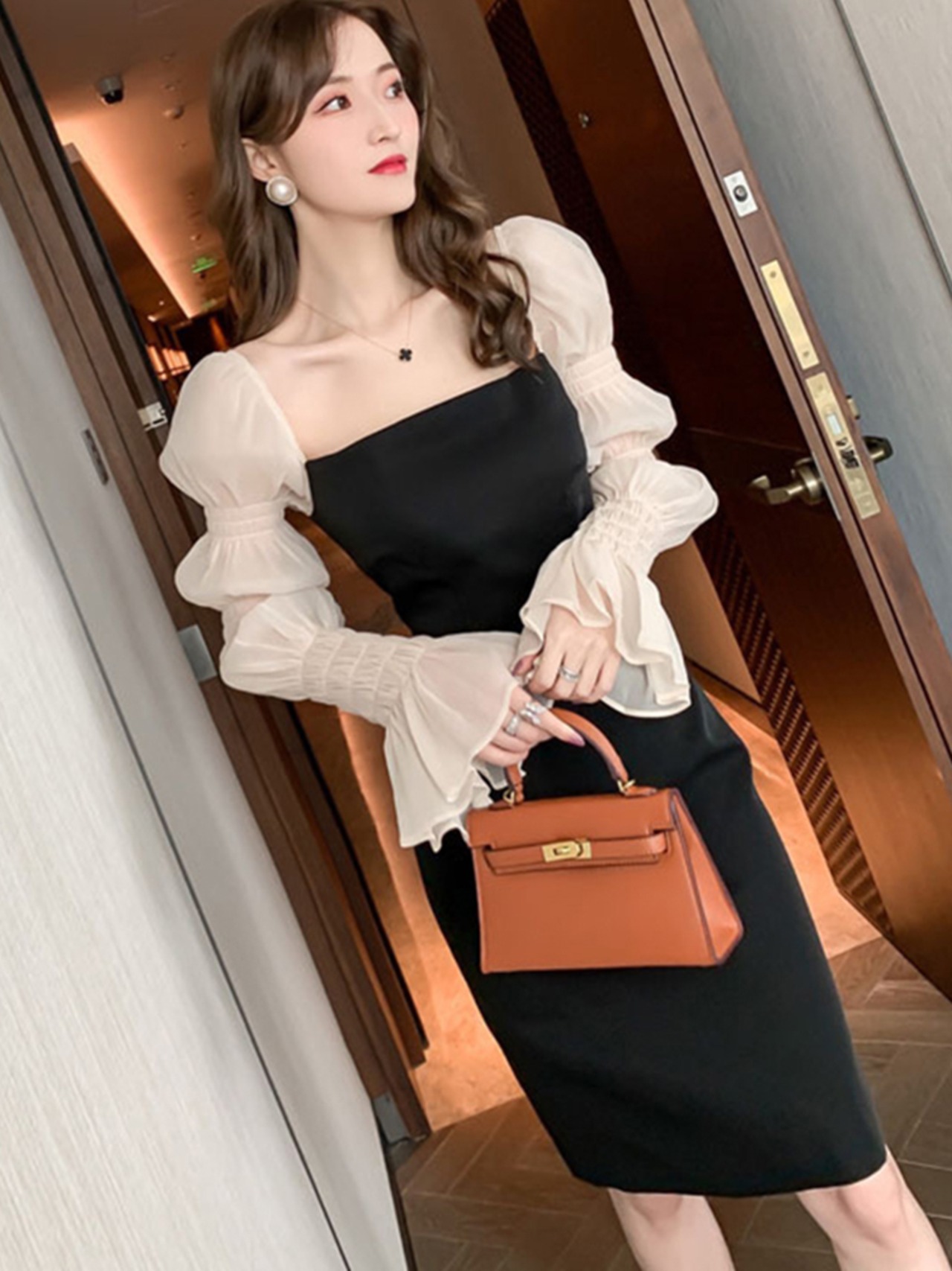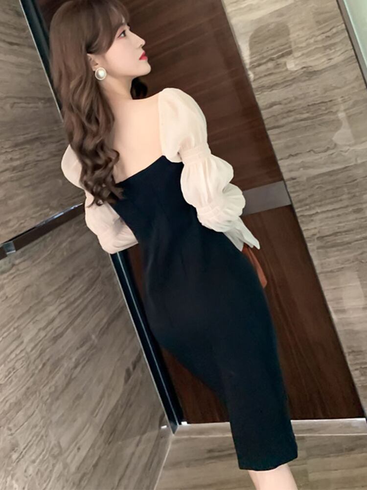 新着ファッションセクシーなパーティーナイトクラブドレス女性エレガントな気質オフィスレディヴィンテージパフスリーブ黒ペンシルドレス ブラック ビンテージ 会社 学校 通勤や通学にも