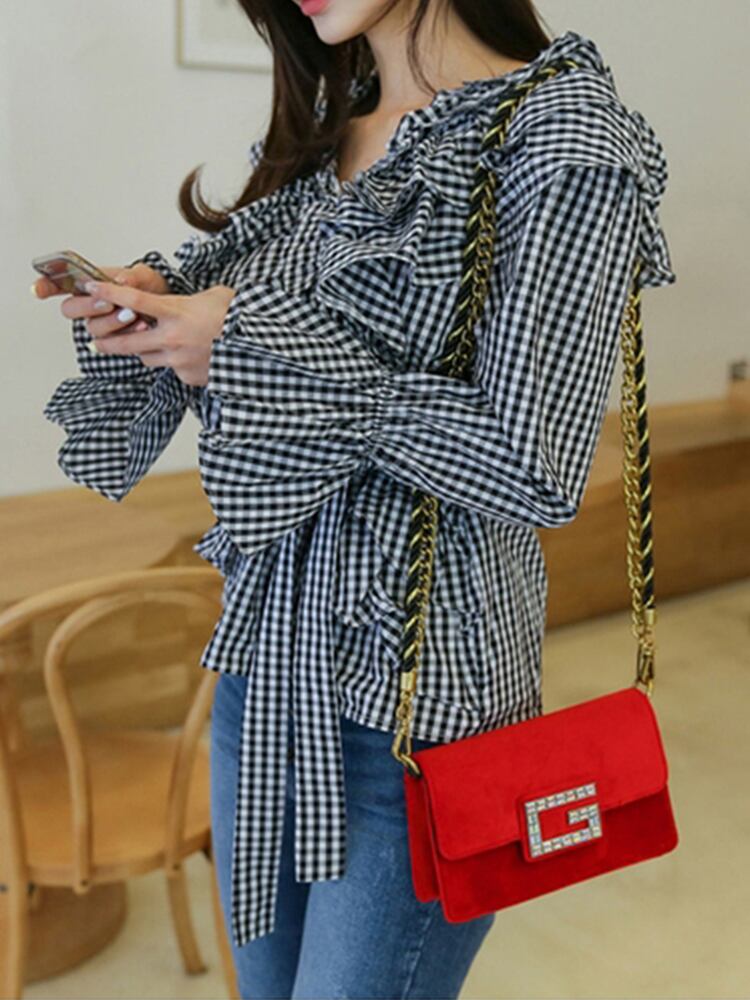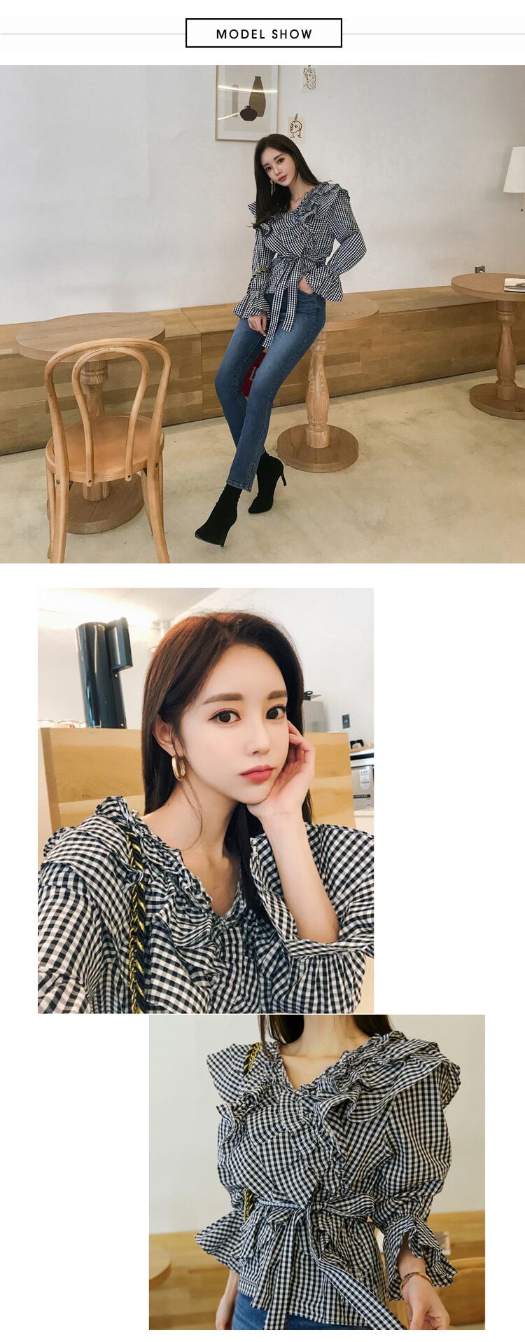 春秋の女性のシャツフリルチェック柄シングルブレストフレアスリーブレースアップスリムブラウス女性トップス スプリング 春物 オータム 秋物