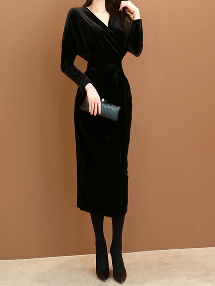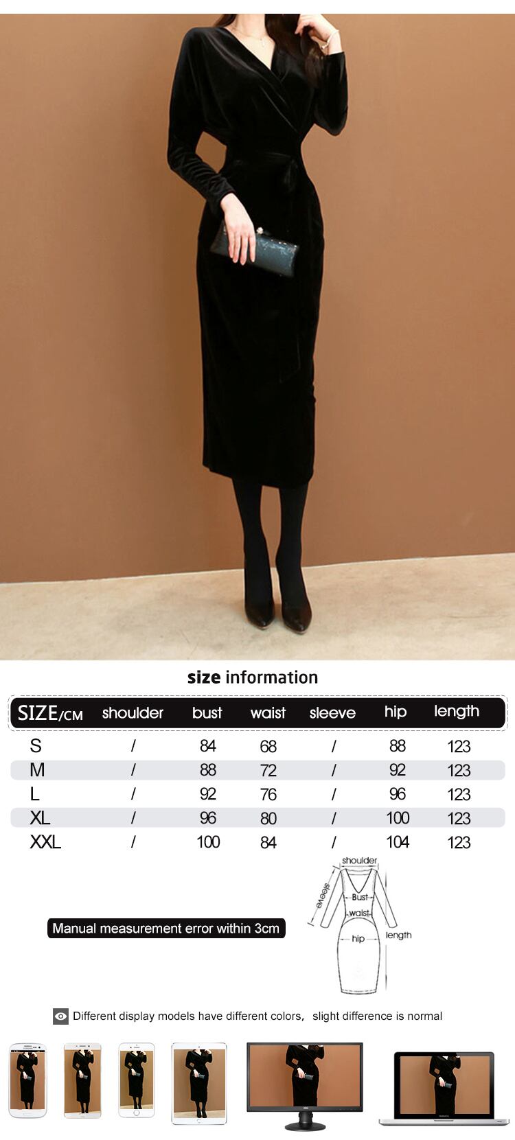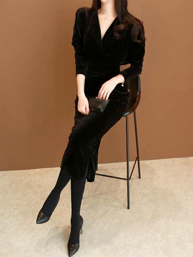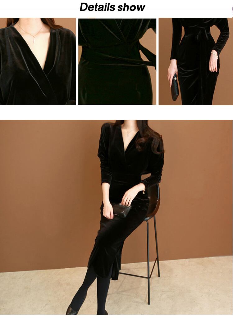 新着ファッション女性ペンシル ドレス OL プロフェッショナル気質 v ネック バットウィング スリーブ ベルベット ヴィンテージ シンプル スリム ブラック ドレス Vネック ビンテージ