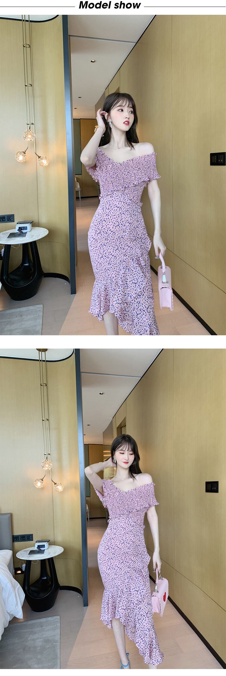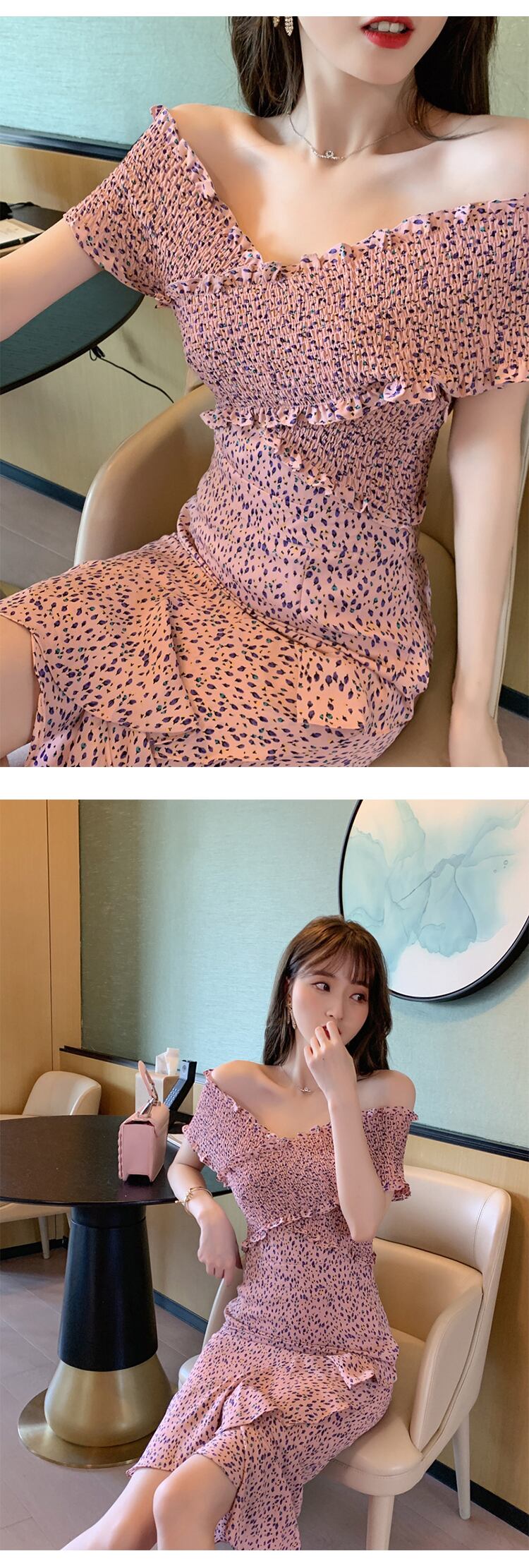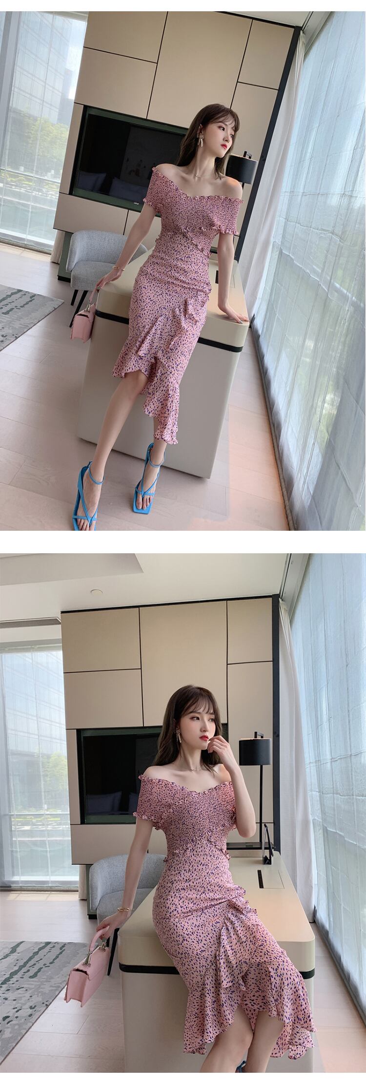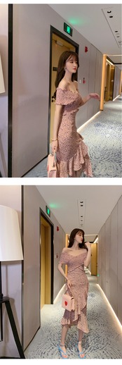 新着ファッション夏の女性 OL セクシーなオフショルダー背中の開いたフリル プリント弾性ホリデー パーティー ビーチ ミディ ボディコン ドレス エラスティック 伸縮 サマー 夏物