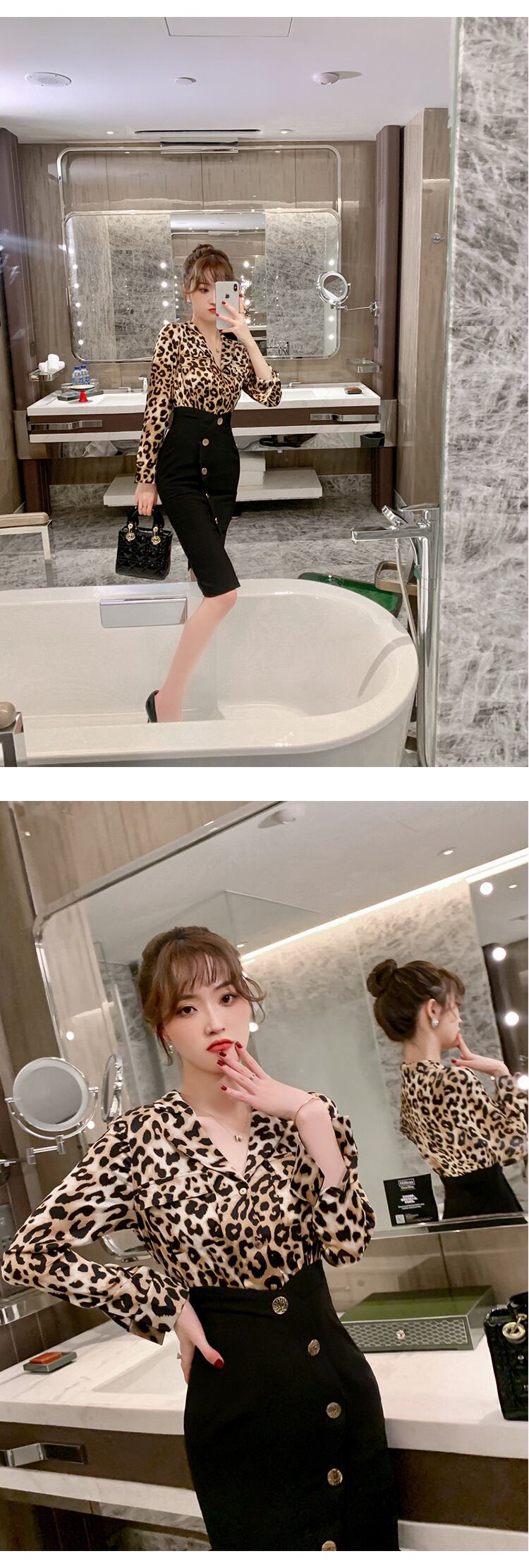 新着ファッション韓国春ミディビーチドレス女性 OL 気質セクシーなヒョウ柄アセテート長袖スリムペンシルドレス ロング スプリング 春物