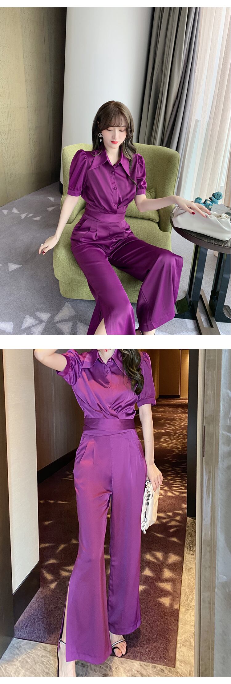 新着ファッション韓国サテン女性夏 OL 気質エレガントなへそショート シャツとワイドレッグ スプリット パンツ 2 点セット サマー 夏物