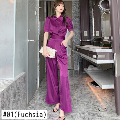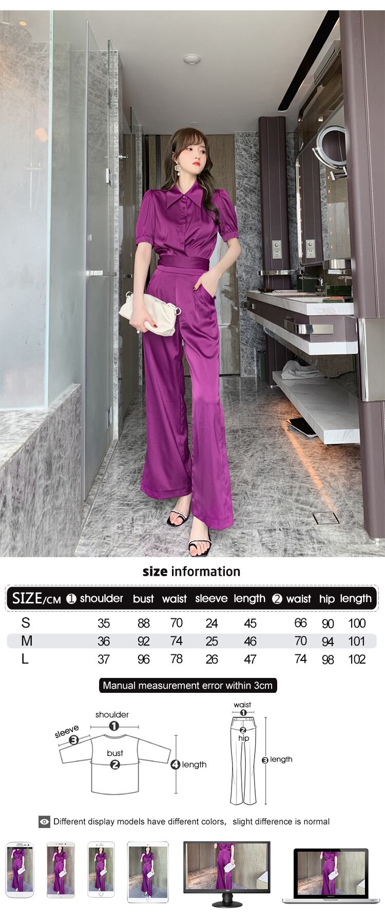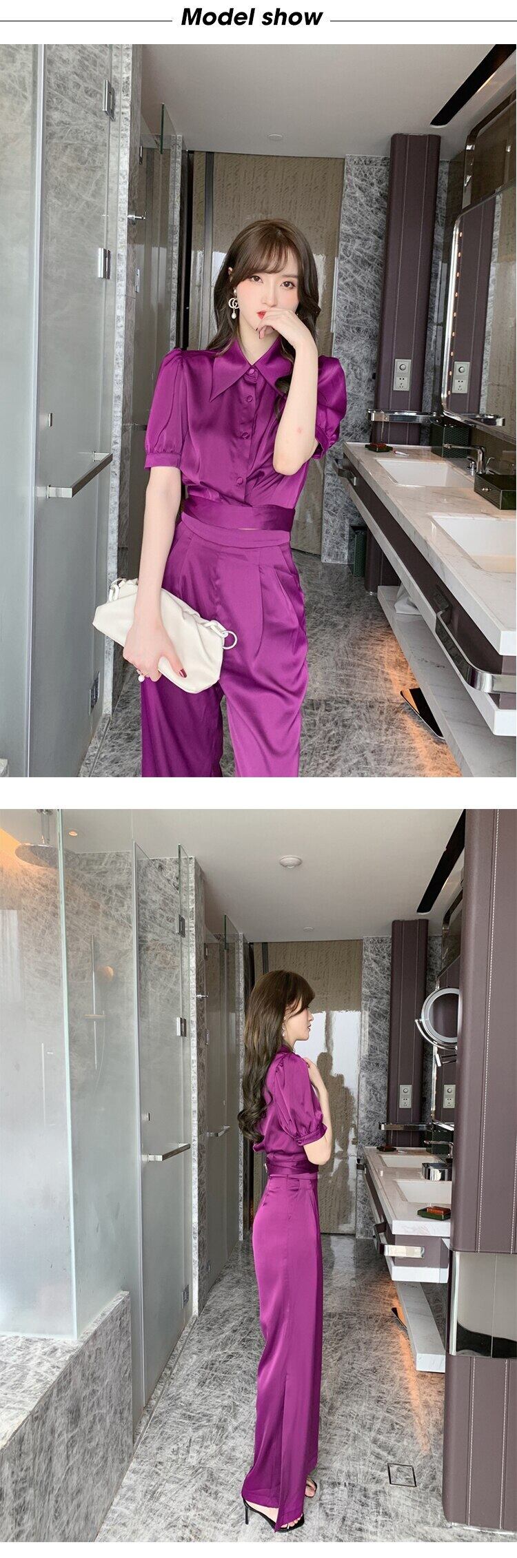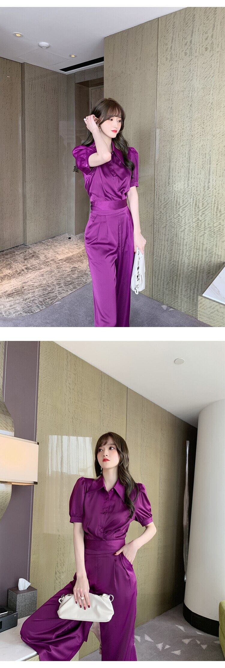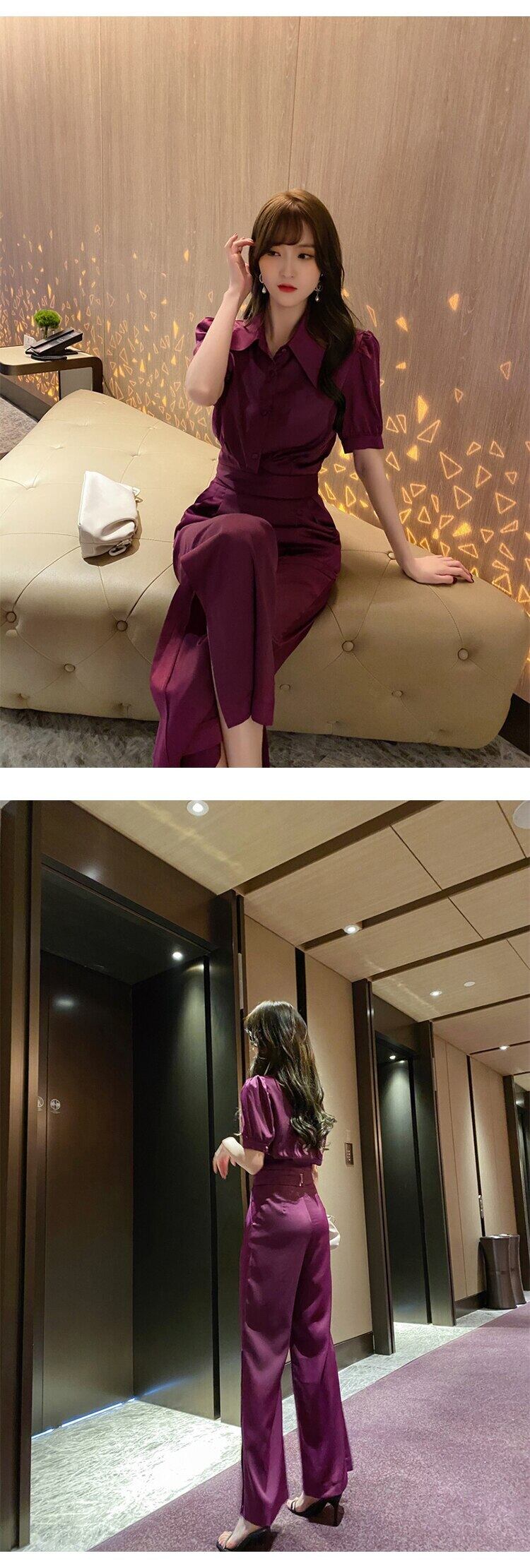 2点セット オフィス レディース シンプル パープル シングルブレスト 半袖 ショート クロップ トップス シャツ スリット パンツ 衣装 ハーフスリーブ 会社 学校 通勤や通学にも