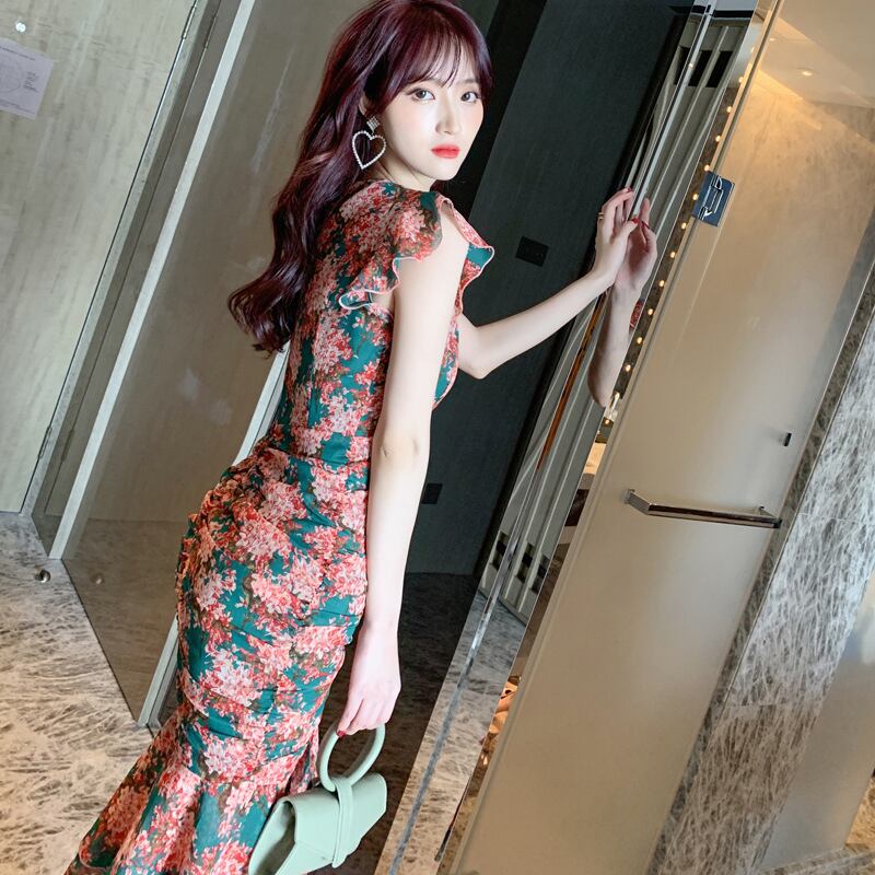 新着ファッション シフォン ラップ ドレス女性エレガントな夏フリル プリント ビーチ気質オフィス レディ スリム マーメイド ドレス サマー 夏物 会社 学校 通勤や通学にも