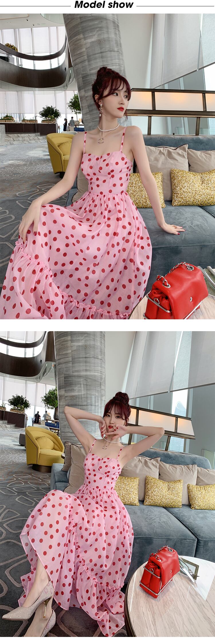 新着ファッション夏の女性のエレガントな甘いセクシーなストラップレスの背中の開いたシフォンドットプリントピンクビーチホリデーパーティーロングドレス 大人ガーリー スウィート キュート カジュアル サマー 夏物