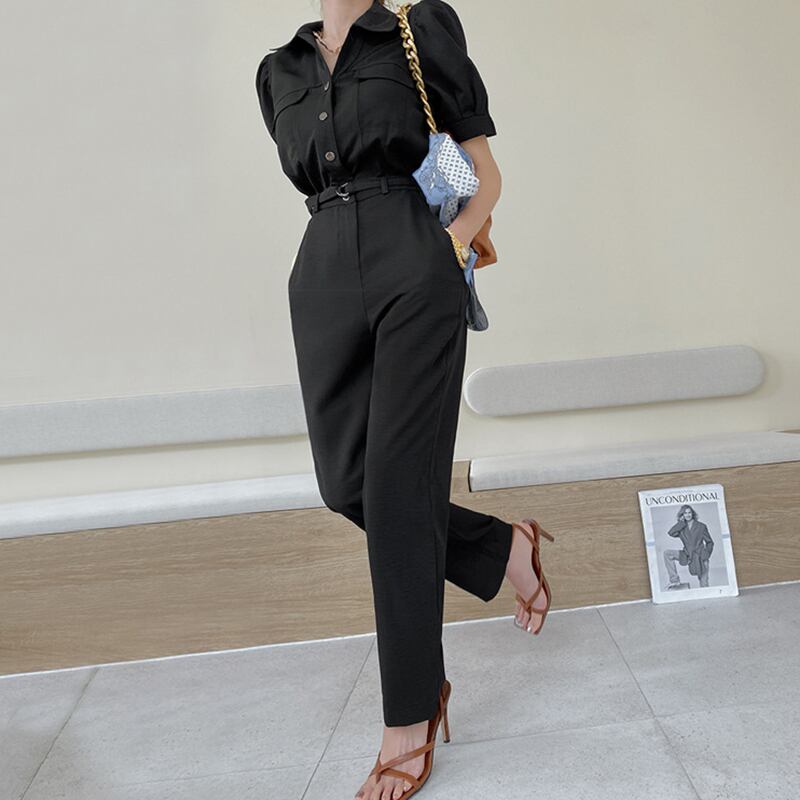 新着ファッション夏カジュアルジャンプスーツ女性半袖エレガントな気質オフィスレディシンプルな黒スリムロングジャンプスーツ ショート ブラック ハーフスリーブ サマー 夏物 会社 学校 通勤や通学にも