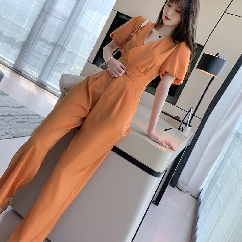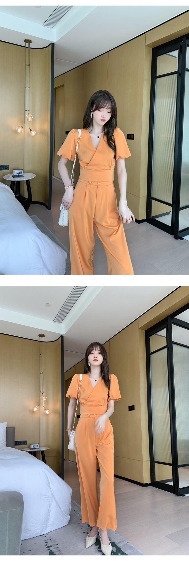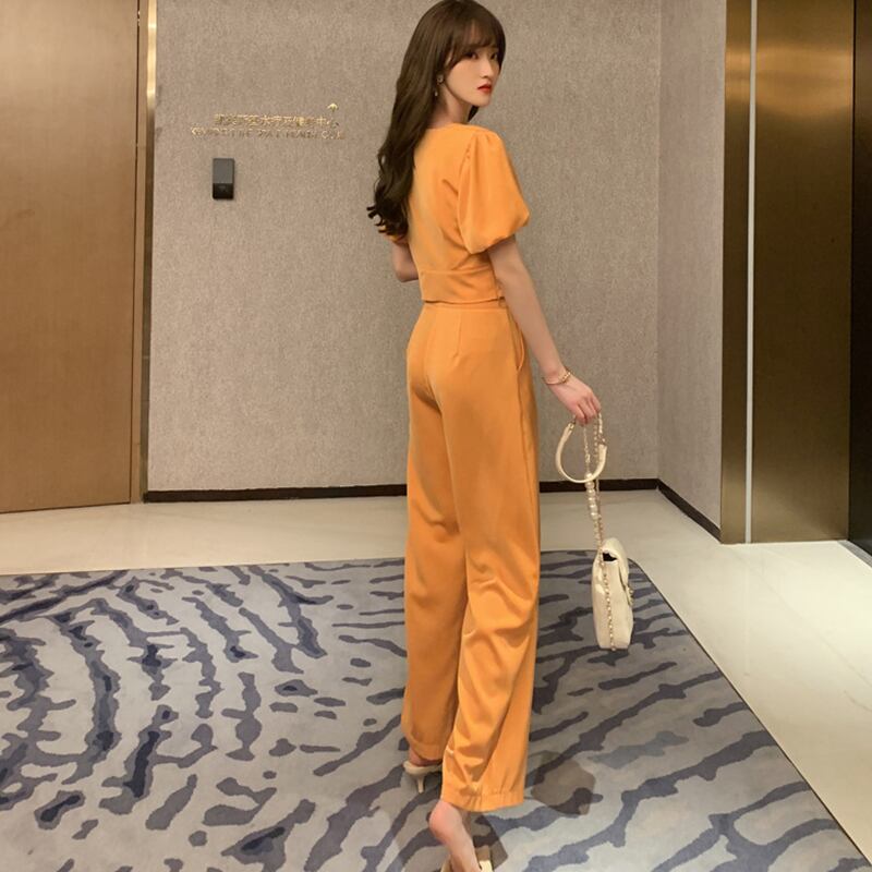 セット女性夏気質パフスリーブオフィスレディワークスタイルシンプル無地パンツとトップス 2 点セット サマー 夏物 ソリッドカラー 会社 学校 通勤や通学にも