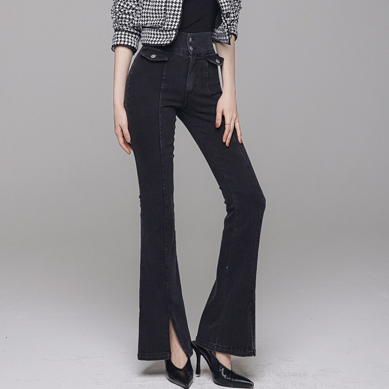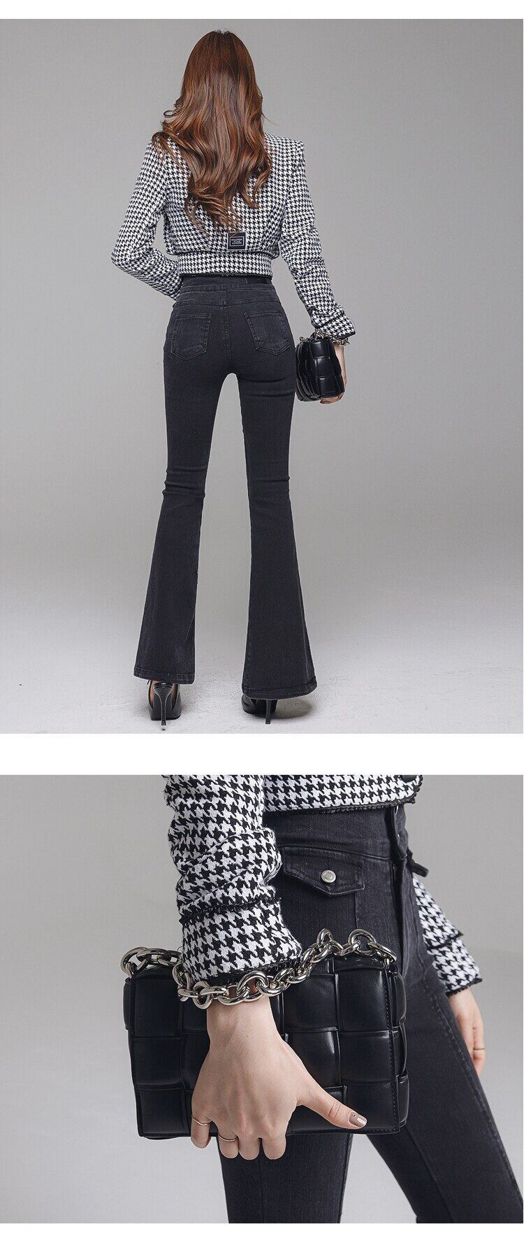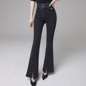 新着ファッション春パンツ女性気質シンプルなハイウエスト野生のファッションスリム黒デニムスリムフレアパンツロング ハイウェスト ブラック スプリング 春物