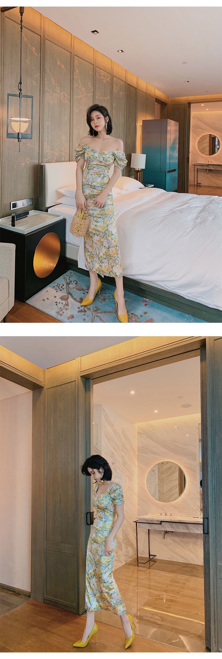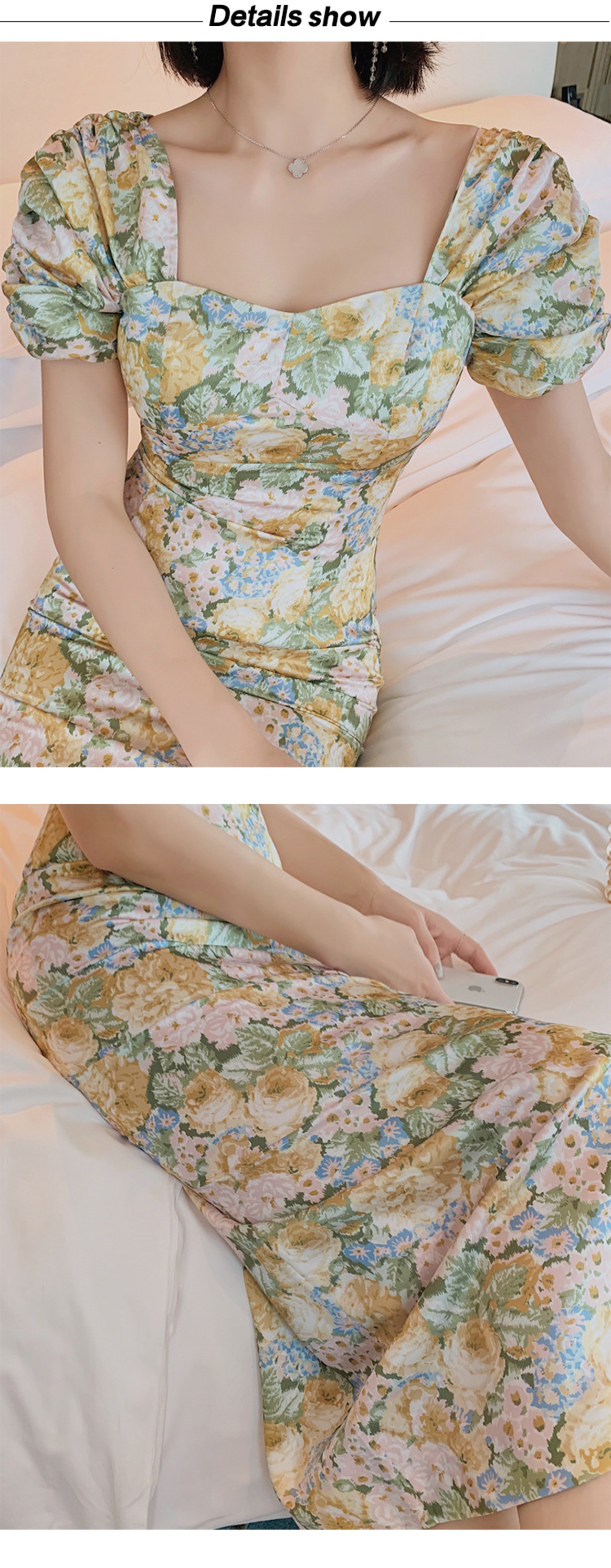 新着ファッションレトロドレス女性エレガントな夏ヴィンテージパフスリーブビーチ気質新鮮なプリントパーティーペンシルロングドレス サマー 夏物 ビンテージ