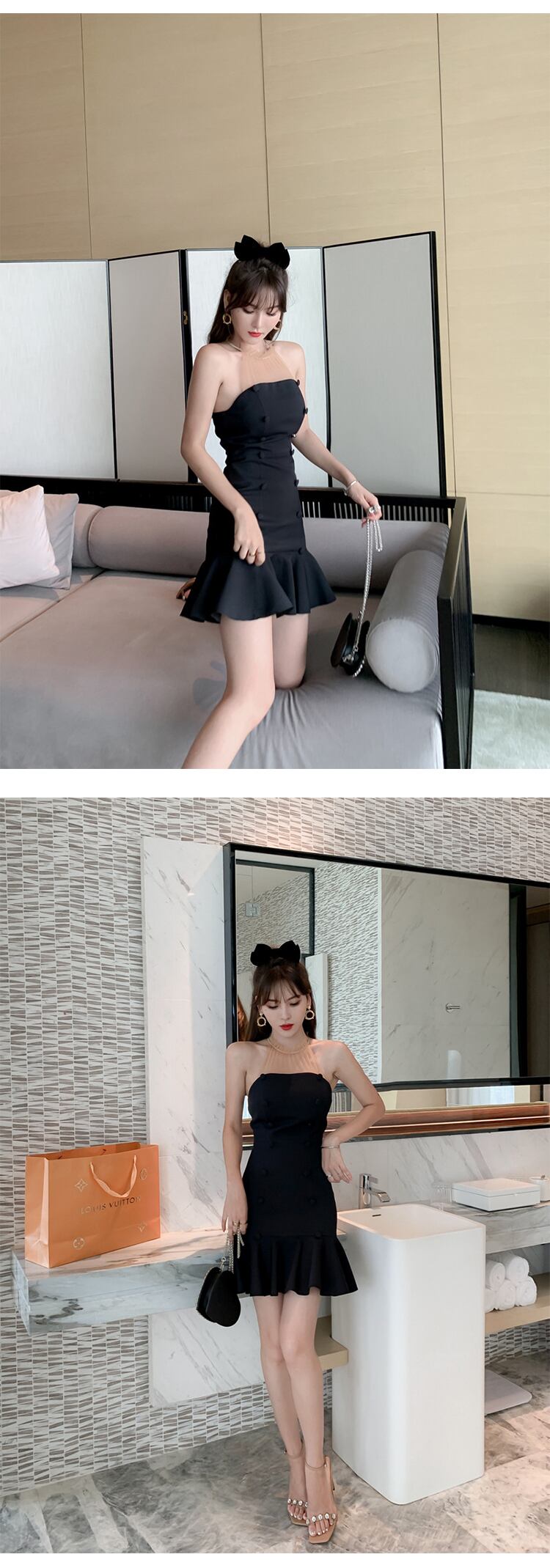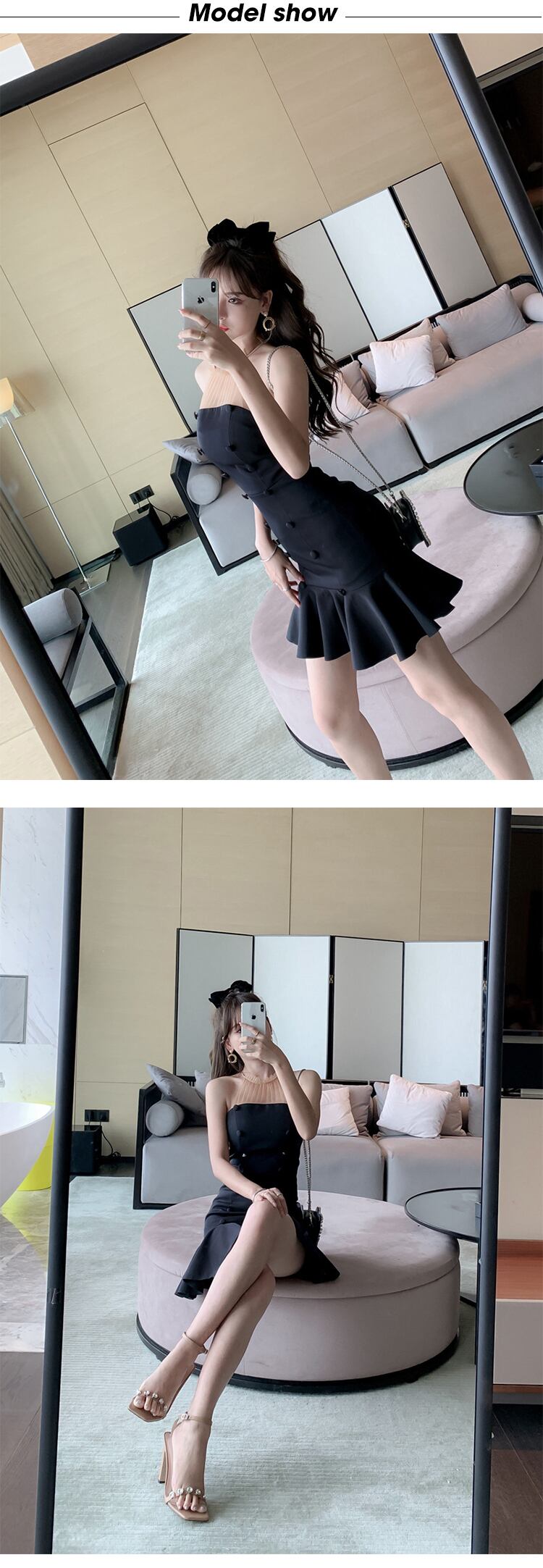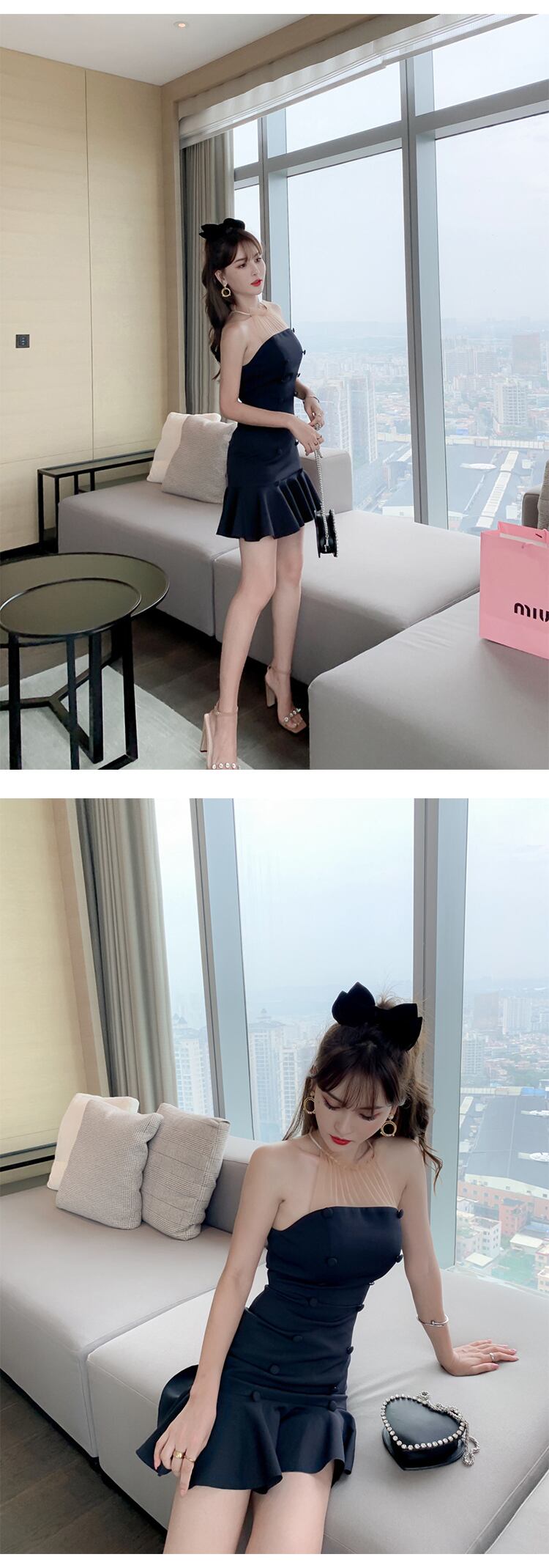 新着ファッション夏ミニ ビーチ ドレス女性 OL エレガントなセクシーなホルター メッシュ パッチワーク背中の開いたフリル スリム ホリデー黒ドレス ブラック サマー 夏物