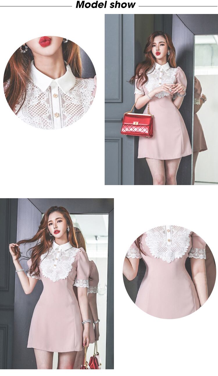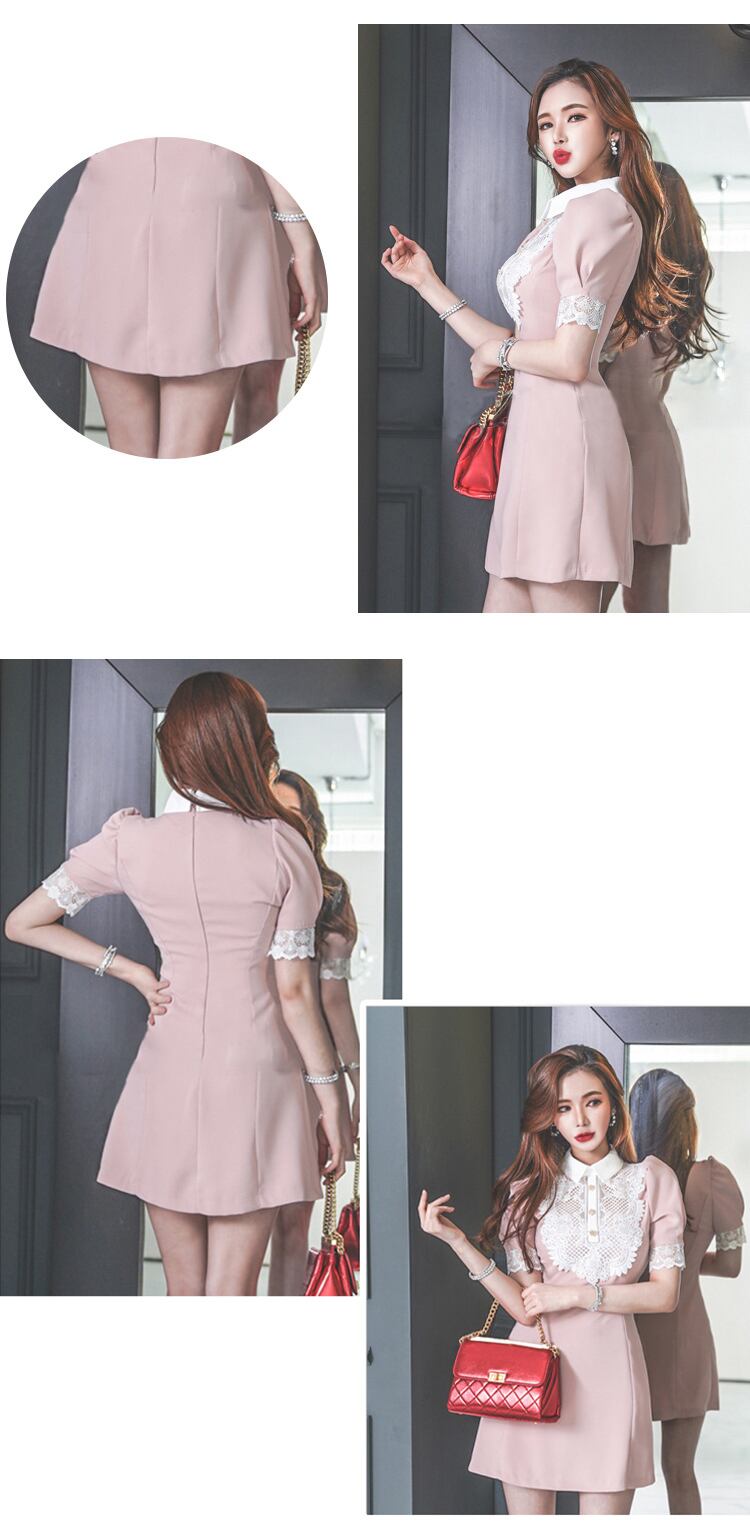 新着ファッションミニドレス女性エレガントな夏のパフスリーブレースパールボタン甘い気質シンプルなピンクの a ラインドレス 大人ガーリー スウィート キュート カジュアル サマー 夏物 Aライン 真珠