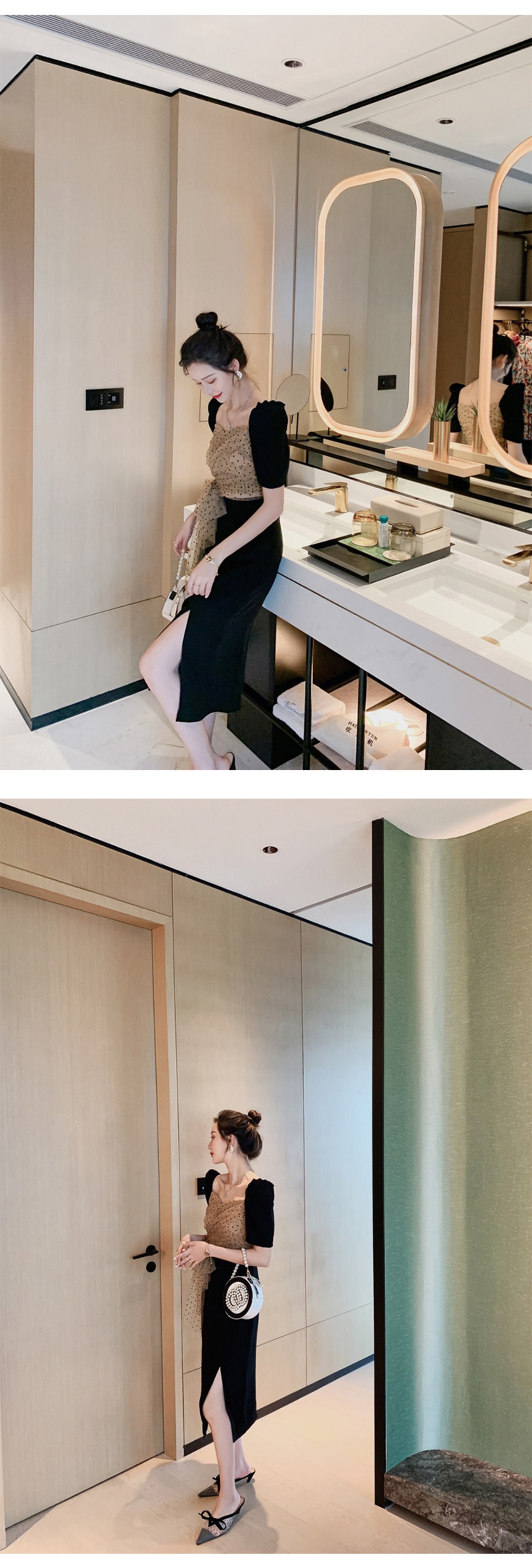 新着ファッション パーティー ドレス女性エレガントな夏メッシュ パフ スリーブ ドット黒気質オフィス レディ スリム スプリット ペンシル ドレス ブラック サマー 夏物 会社 学校 通勤や通学にも