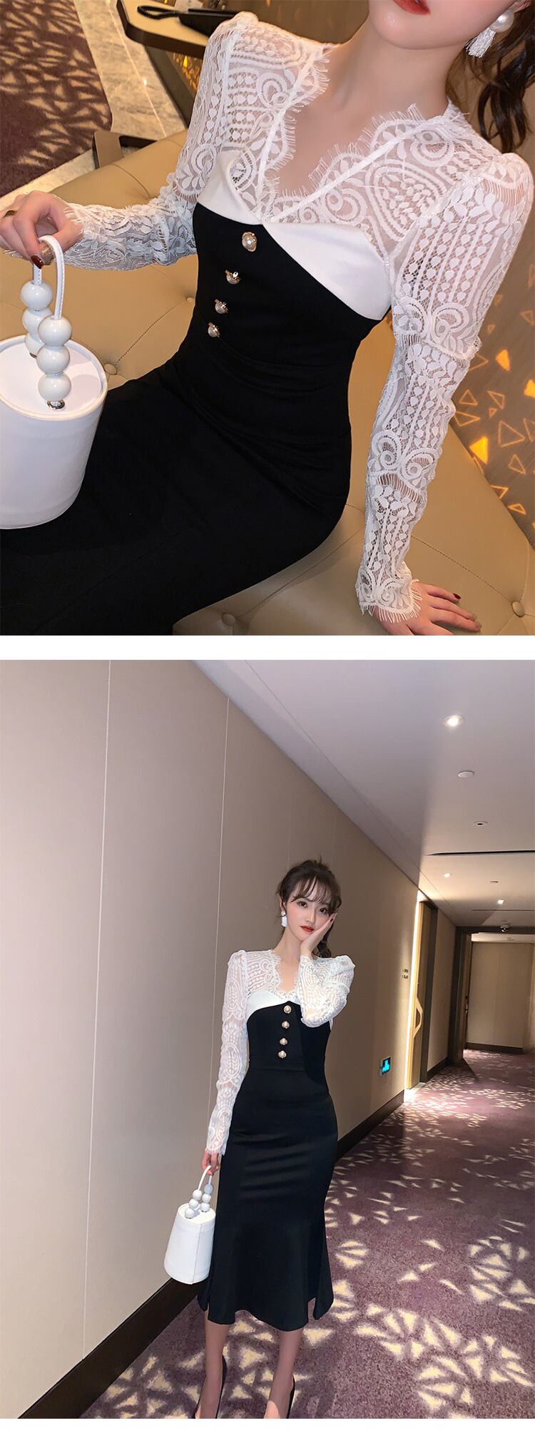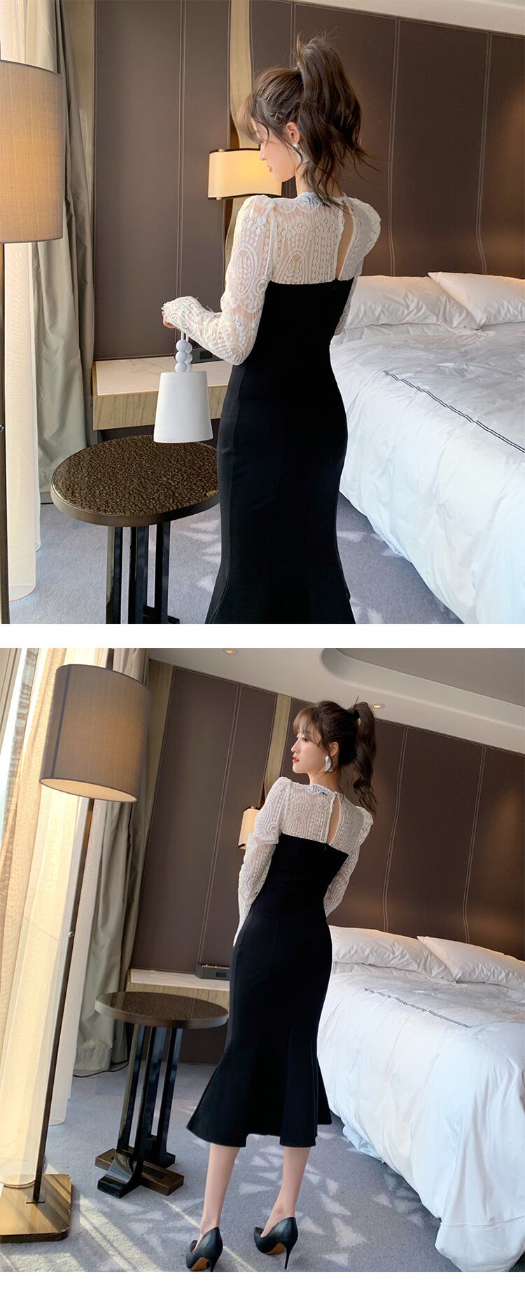 女性韓国のエレガントな新着気質ワークスタイルパッチワークレース透視ドレスヴィンテージスリムトランペットドレス ビンテージ