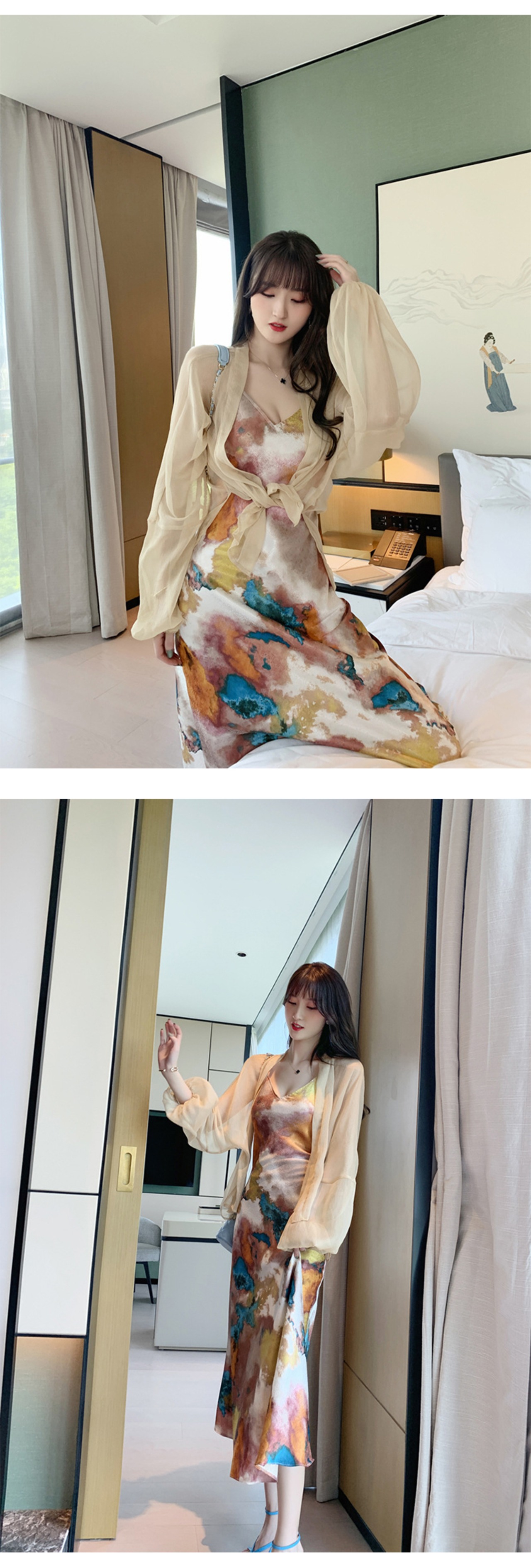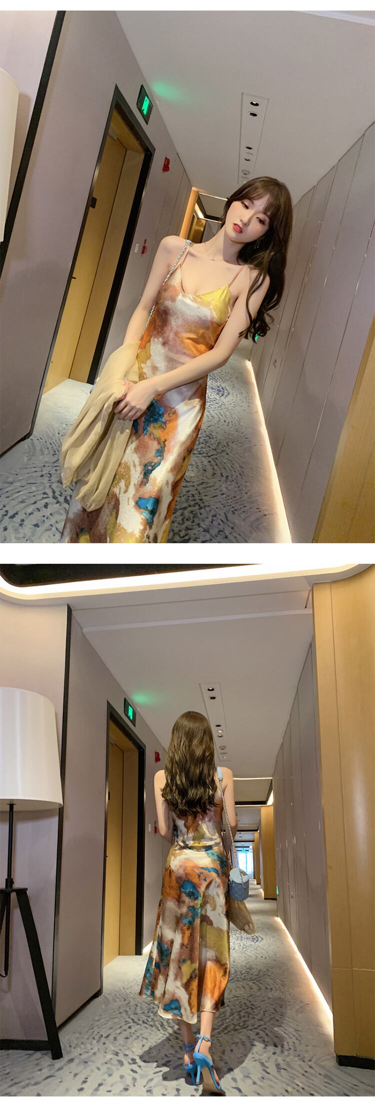 新着ファッション韓国夏ロングビーチドレス女性 OL 気質プリントセクシーなストラップノースリーブサテンスリムホリデードレス サマー 夏物