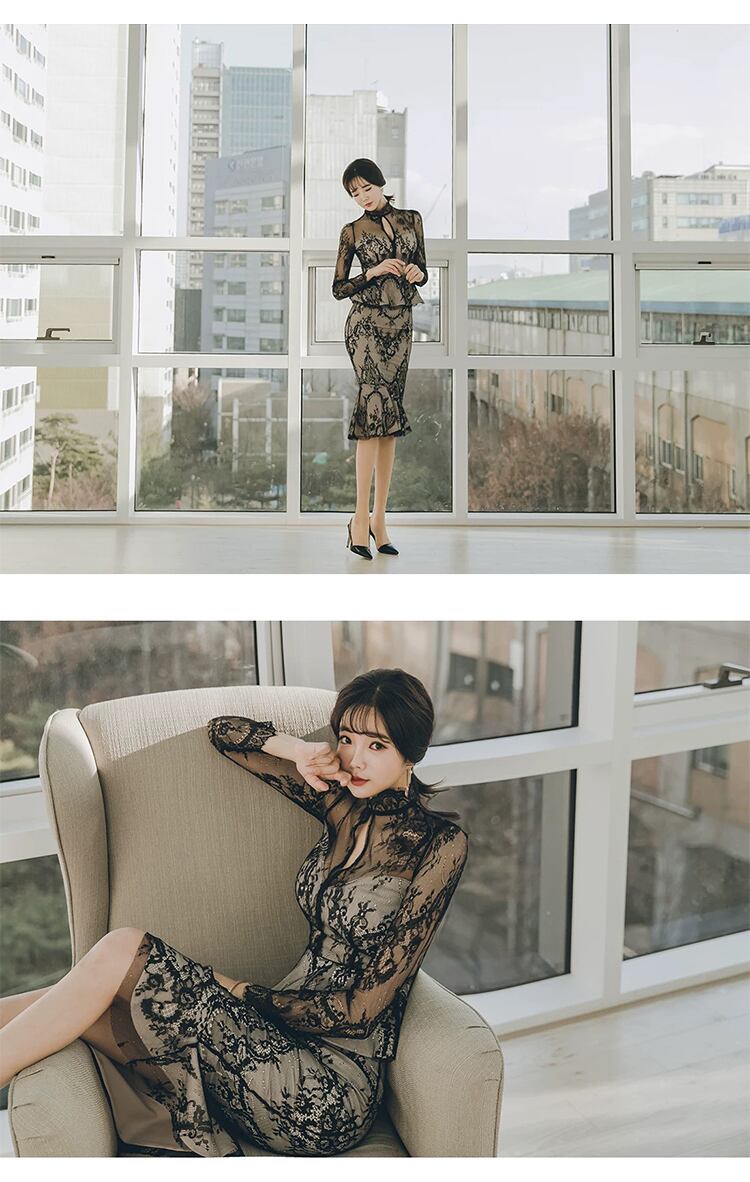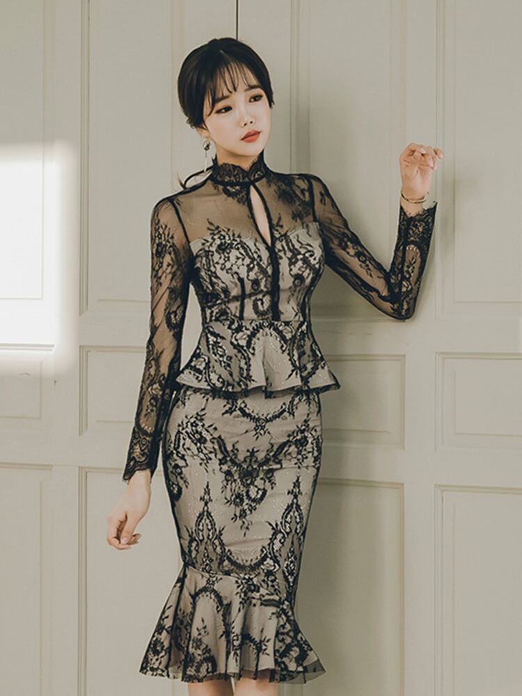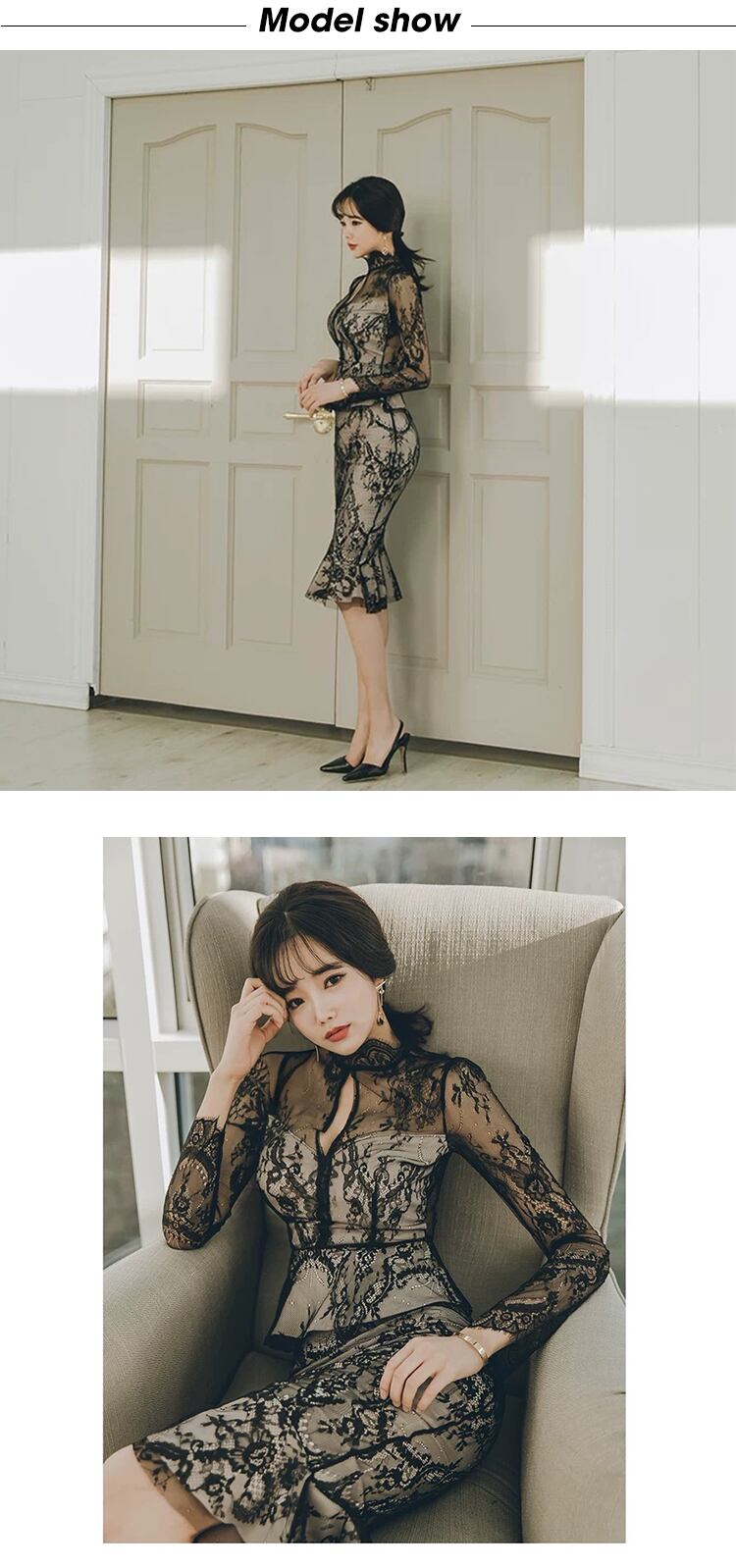 レースの女性のイブニングドレスシックなフリルシアーセクシーな O ネックボディコンスリムミディパーティークラブウエディング黒ローブ Vestidos ブラック Oネック