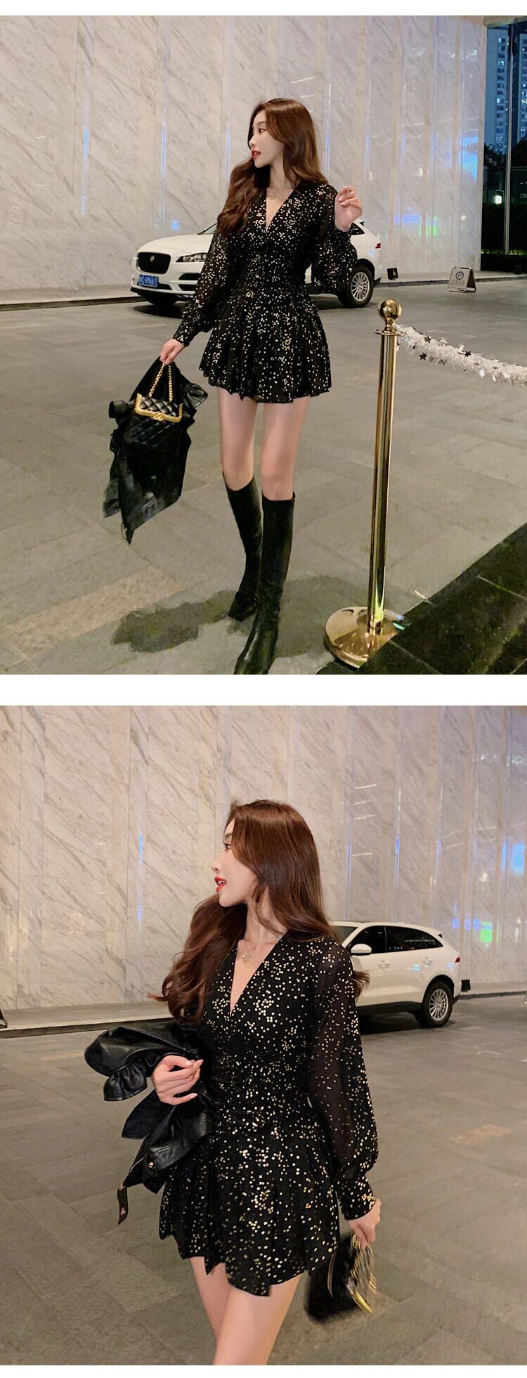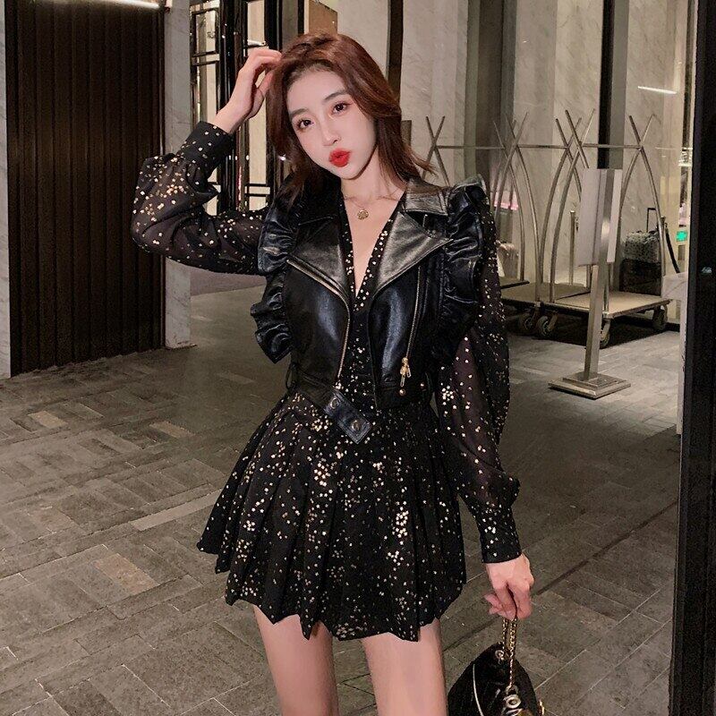 新着ファッション春ツーピースセット女性 OL 職業気質ショートベストコートと花柄ドレススリム黒セット ブラック スプリング 春物