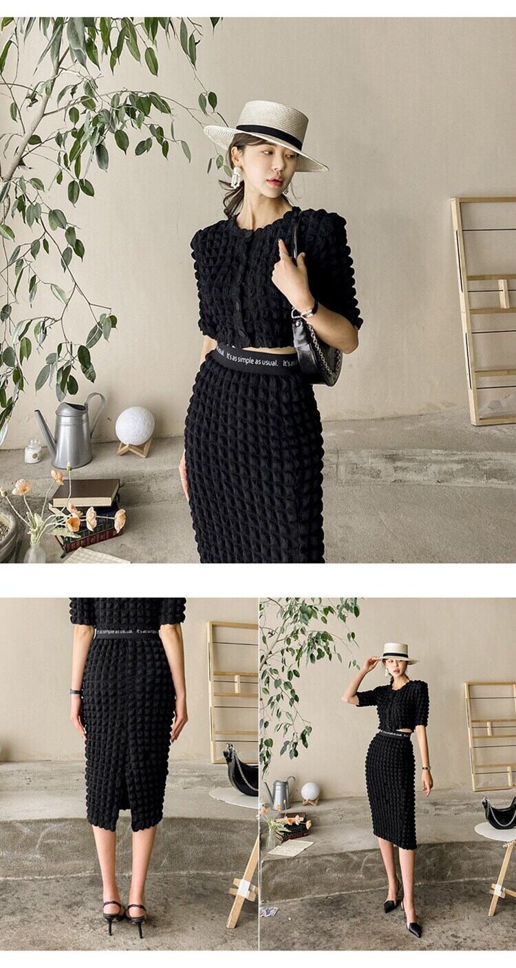 2 ピース衣装女性レディシングルブレストショートトップスシャツブラウスウエストミディスカートスリムクロップドセット