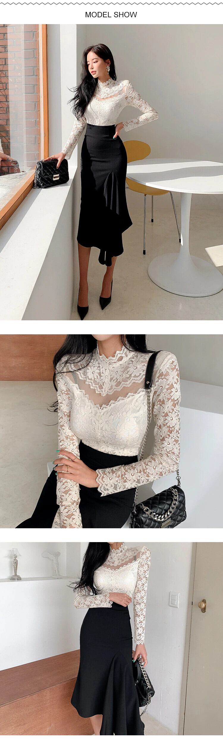 春秋 2 個女性の気質セクシーな視点レースシャツトップスウエストミディスカートスリムセット衣装 スプリング 春物 オータム 秋物