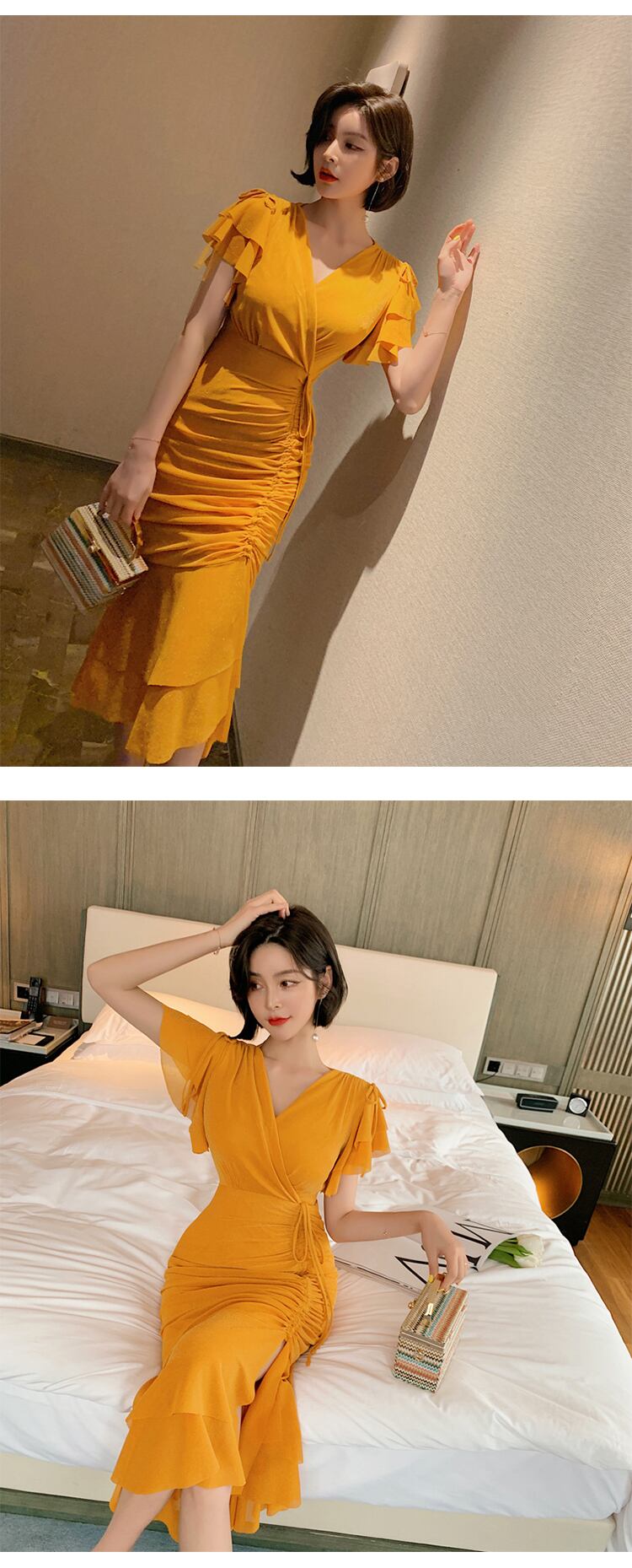 パーティードレス女性の夏のセクシーなフリルスリーブ V ネックオレンジマーメイドミディクラブウエディングビーチストレッチローブドレス サマー 夏物 Vネック