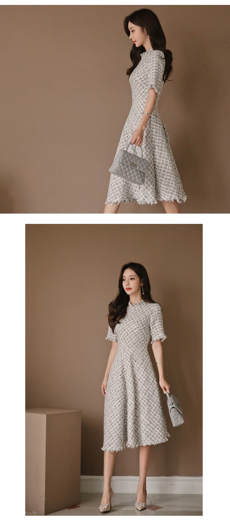 ミディ ツイード ドレス女性高級シックなチェック柄スリム ガウン ローブ パーティー Vestidos
