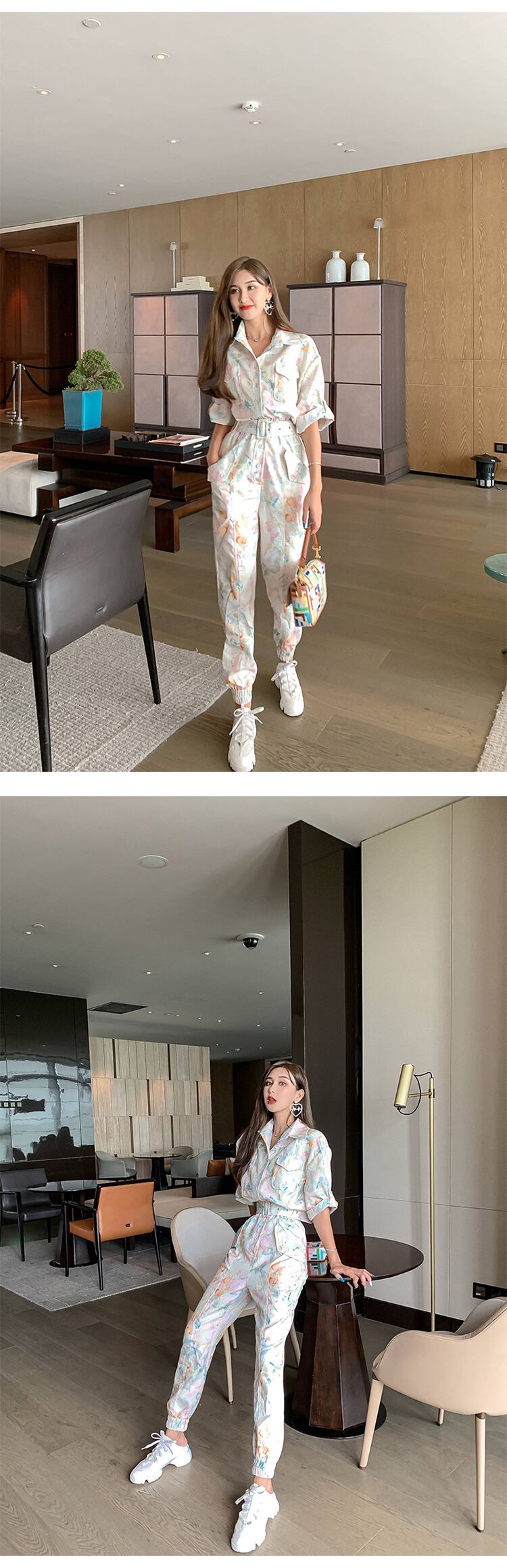 春秋のコットンリネン女性ジャンプスーツプリントシングルブレストウエストカーゴパンツストリート服ロングロンパース スプリング 春物 オータム 秋物