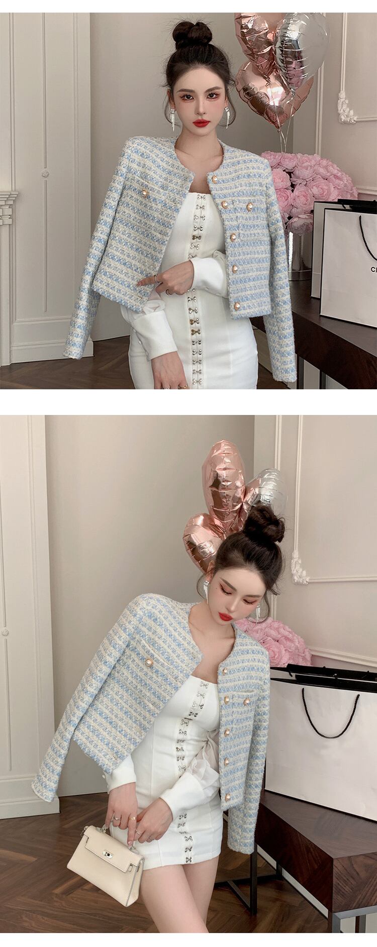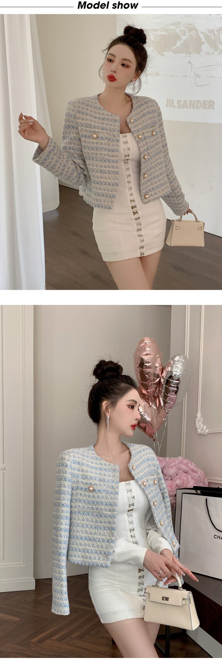 秋冬の女性のコートツイードクリックストライプレトロパールボタンショートルーズトップスジャケットストリート Outwears オータム 秋物 ウィンター 冬物 真珠