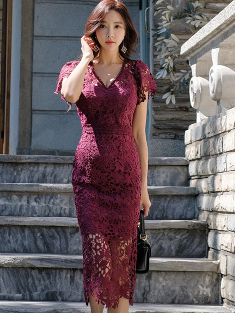 女性のイブニングドレスセクシーなレースシアーフローラル中空 V ネック半袖スキニースリムパーティークラブ Vestido 夏 ショート ハーフスリーブ サマー 夏物 花柄 Vネック