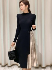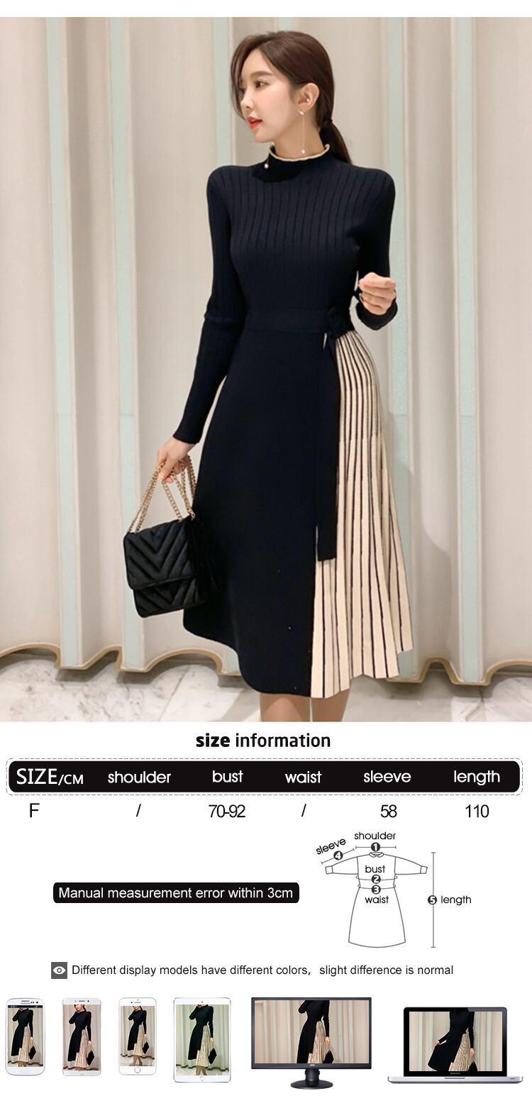 秋冬女性ミディドレスレディシックなニット黒ストレッチベルトプリーツストリートローブ Vestidos ブラック オータム 秋物 ウィンター 冬物 ハーネス