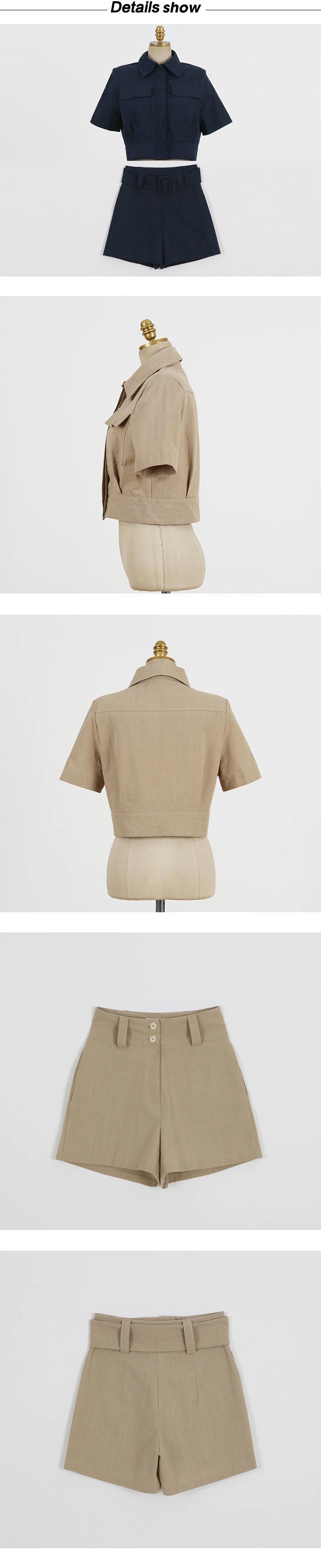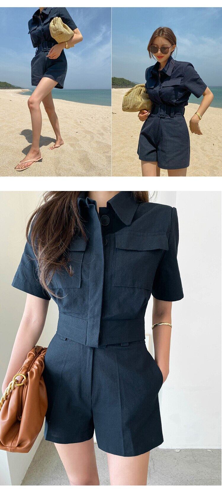 スタイル オフィス セット女性ポケット シングル ブレスト トップス シャツ ブラウス ベルト ウエスト ショーツ 2 点セット衣装 ハーネス ブルマー 会社 学校 通勤や通学にも