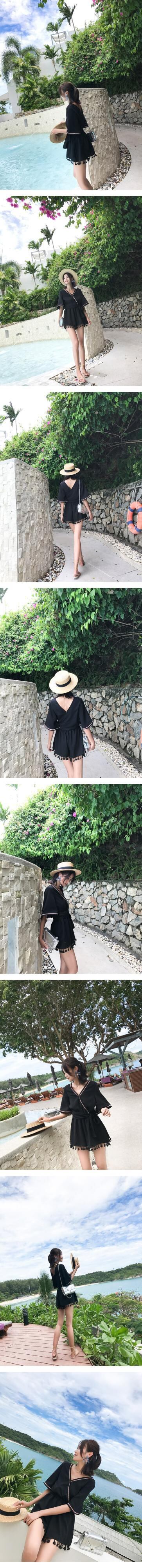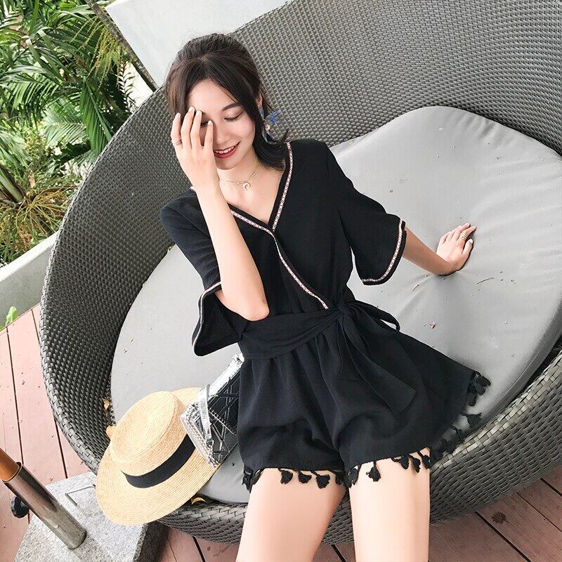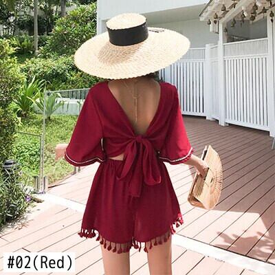 女性新着カジュアル夏comtableジャンプスーツヴィンテージ気質背中の開いたvネック弓かわいい遊び着ロンパース リボン 大人ガーリー スウィート キュート サマー 夏物 ビンテージ