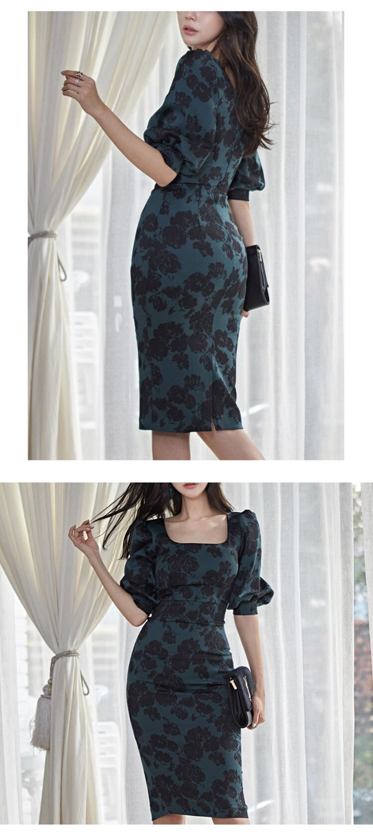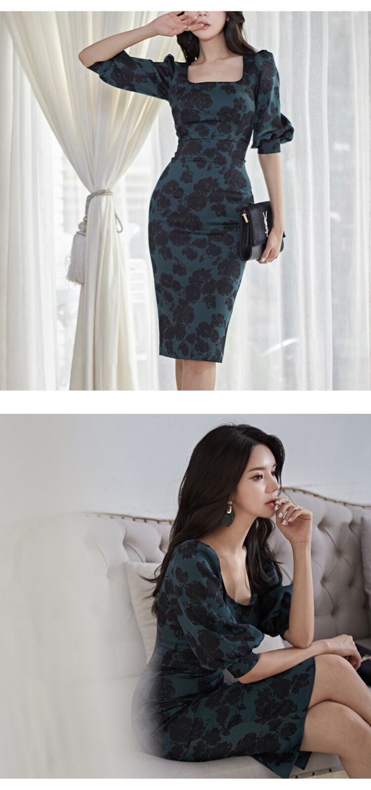 ドレス気質マルフローラルスクエアカラースリムミディパーティーストリートローブ Vestidos 花柄 スクウェア