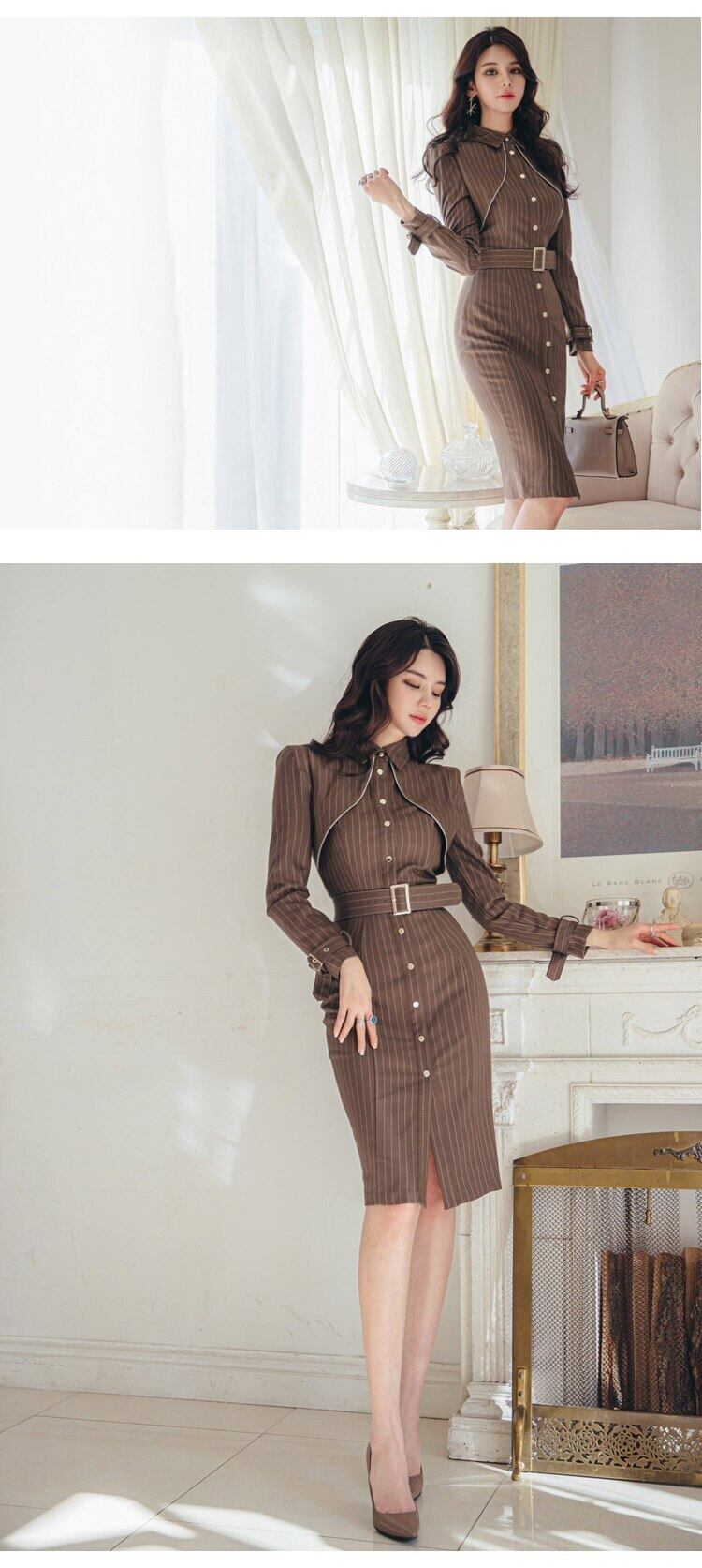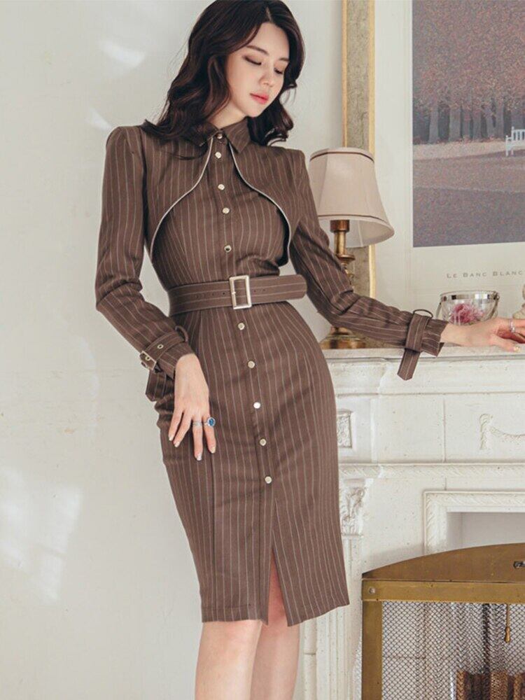 秋春コンタブルストライプワークスタイルドレス気質サッシュシングルブレストヴィンテージエレガントオフィスマルペンシルドレス スプリング 春物 オータム 秋物 ビンテージ 会社 学校 通勤や通学にも