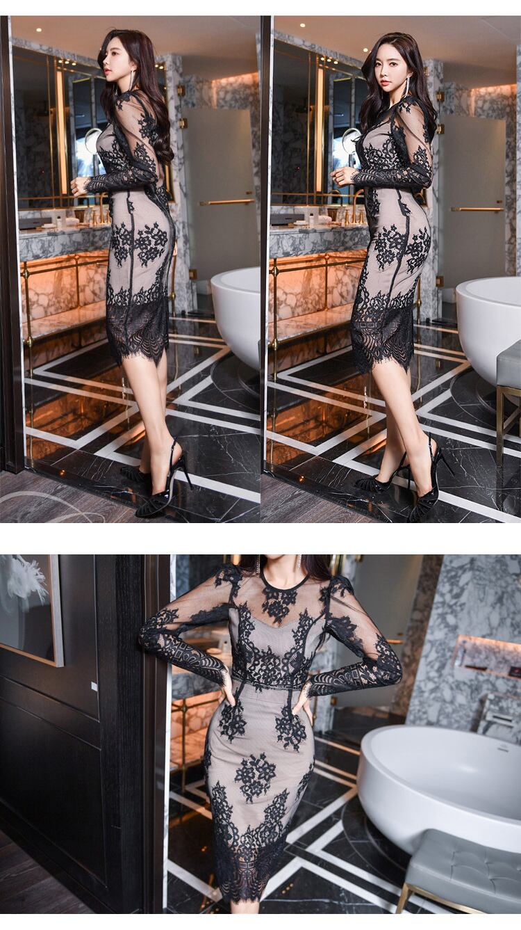 クラブセクシーな 2 ピース衣装レトロな黒のレースシアー O ネックトップスシャツレディパッケージヒップミディスカートボディコンスリムセット ブラック Oネック