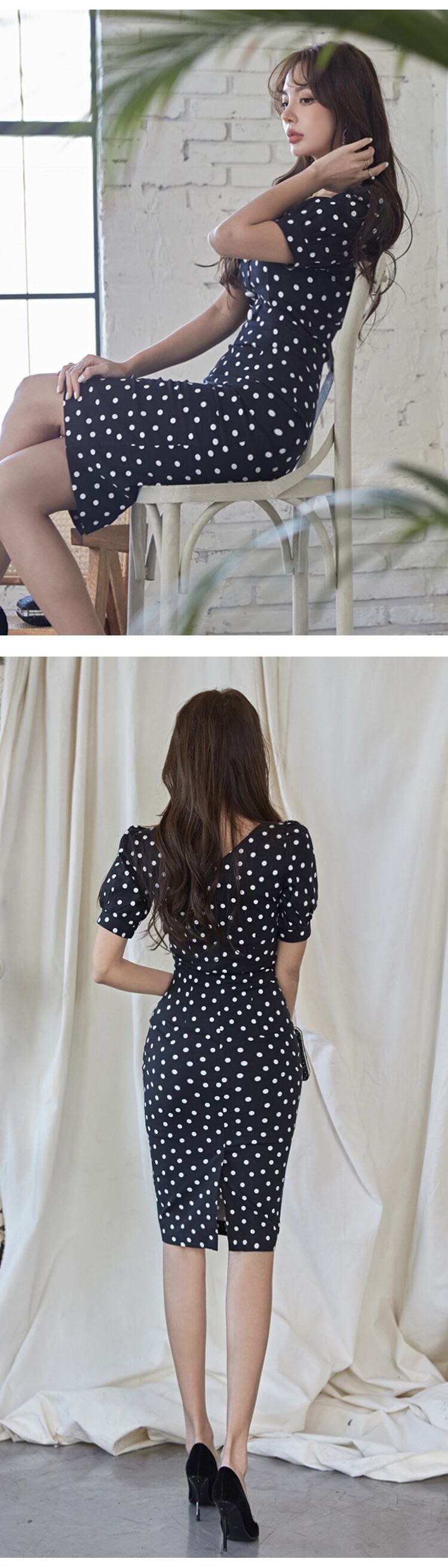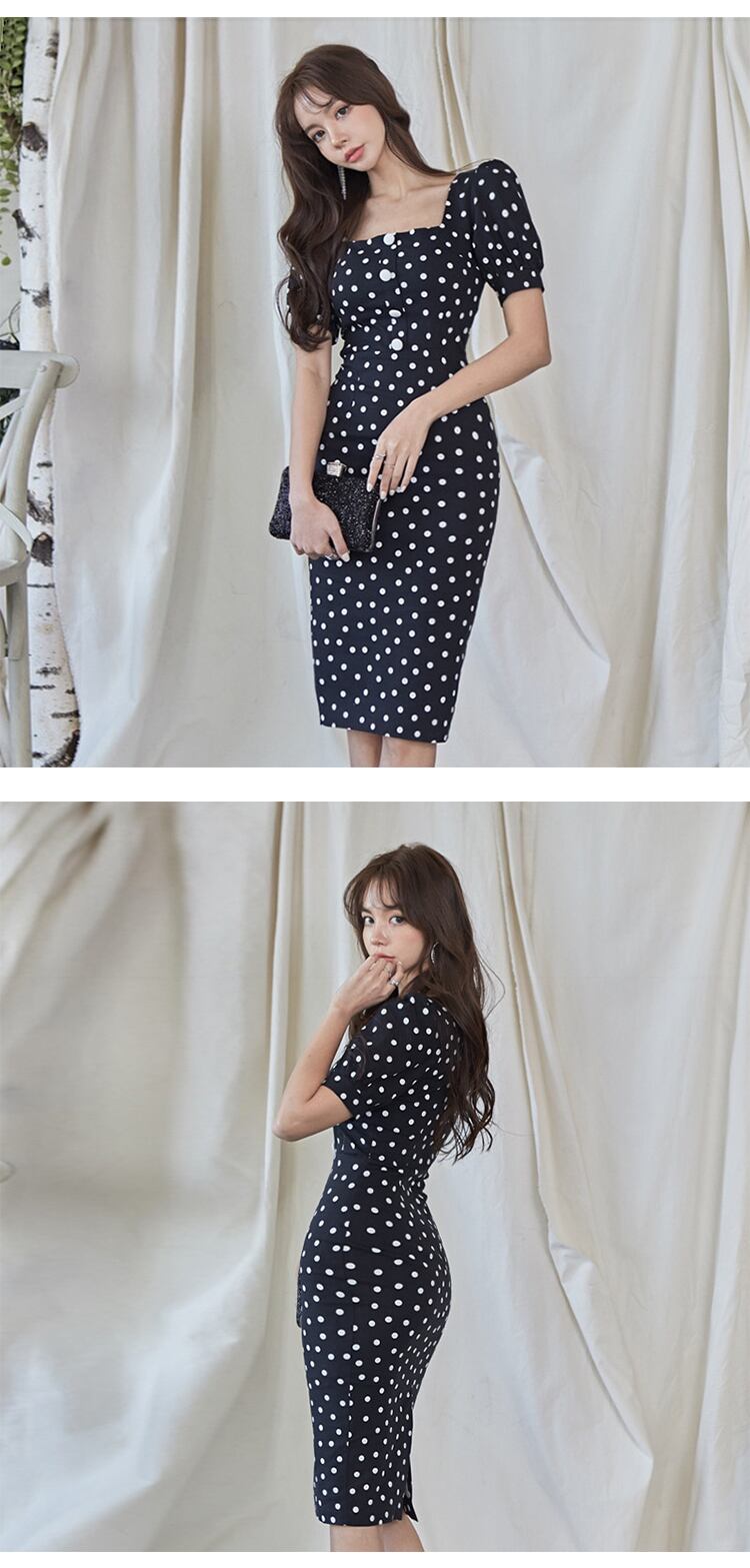 新着ファッションパーティードレスエレガントな夏のヴィンテージスクエアカラーパフスリーブドット気質スリムミディペンシルドレス サマー 夏物 スクウェア ビンテージ