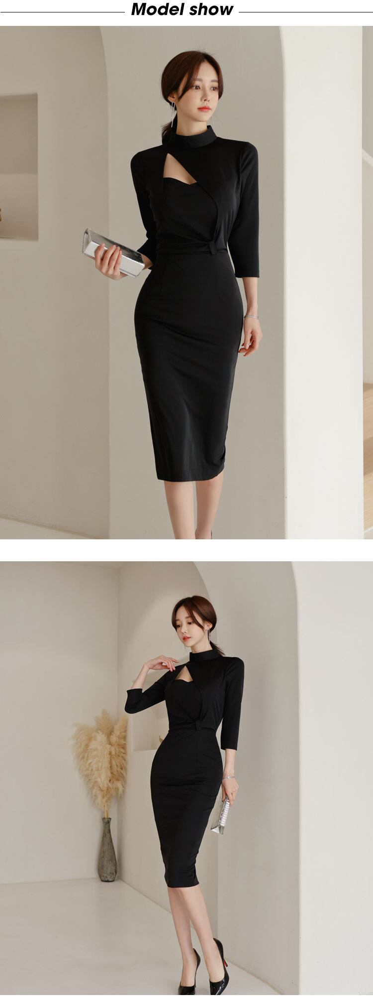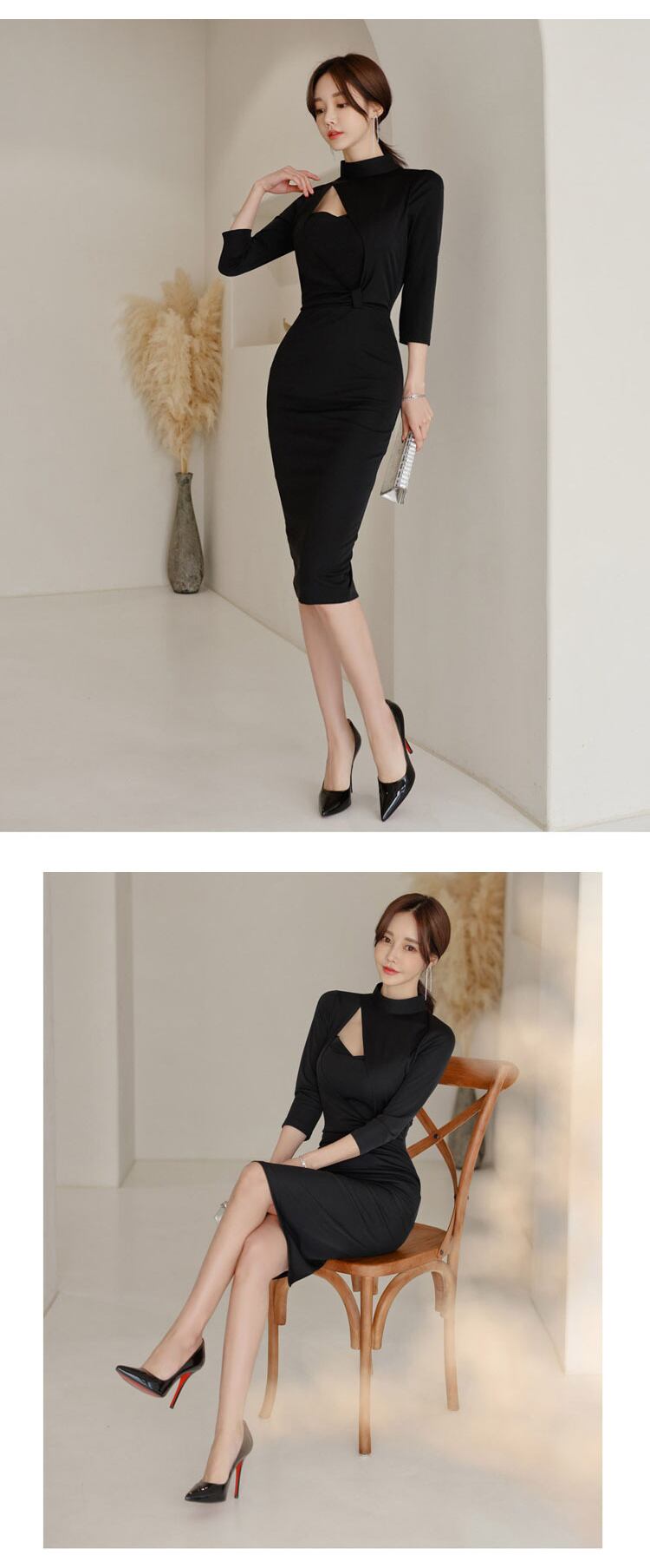 新着ファッション春ミディドレス OL 気質セクシーなスタンドカラー中空 3/4 スリーブ黒スリムスプリットペンシルドレス ブラック スプリング 春物