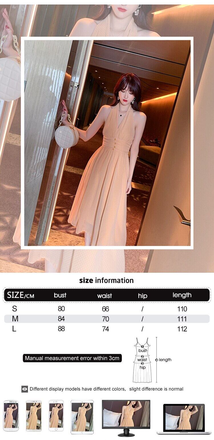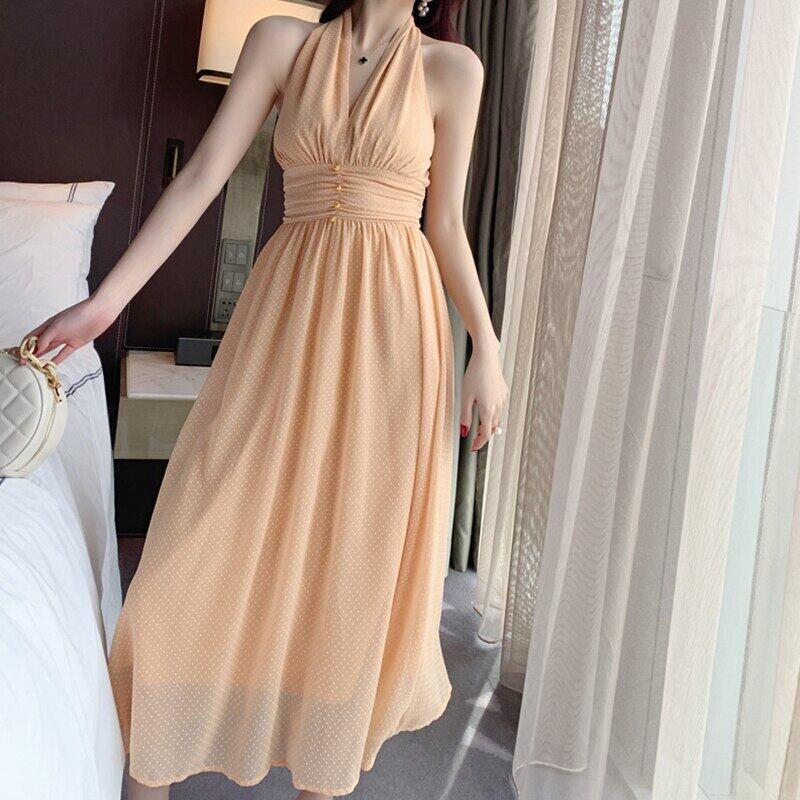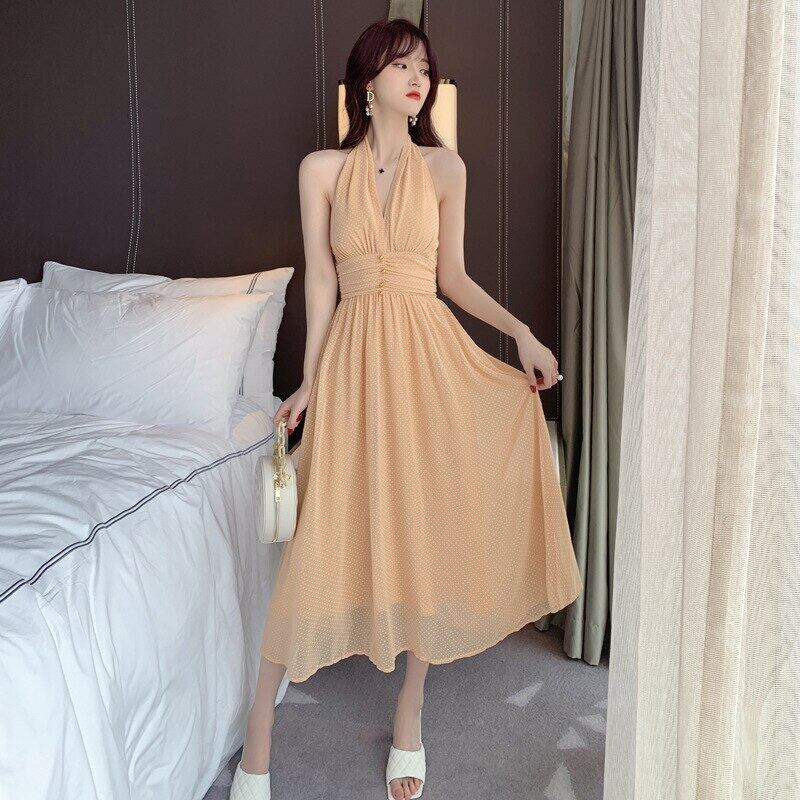 新着ファッションセクシーなパーティーナイトクラブドレスのエレガントな夏の背中の開いたホルターネックパール気質シフォン a ラインドレス サマー 夏物 Aライン 真珠