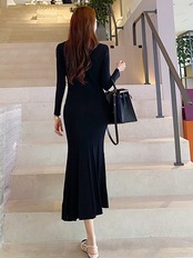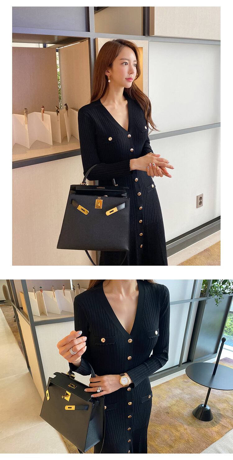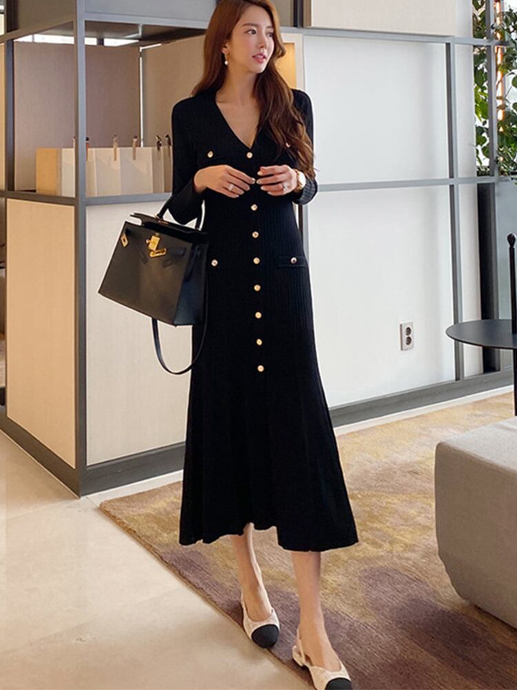 新着ファッションニット弾性新鮮なドレスエレガントなワークスタイル甘いかわいい暖かいシングルブレストトランペットドレス エラスティック 伸縮 大人ガーリー スウィート キュート カジュアル