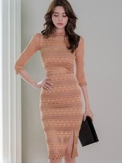新着ファッションcomtable無地マルドレスエレガントなヴィンテージワークスタイルスリムレース透視ペンシルドレス ソリッドカラー ビンテージ