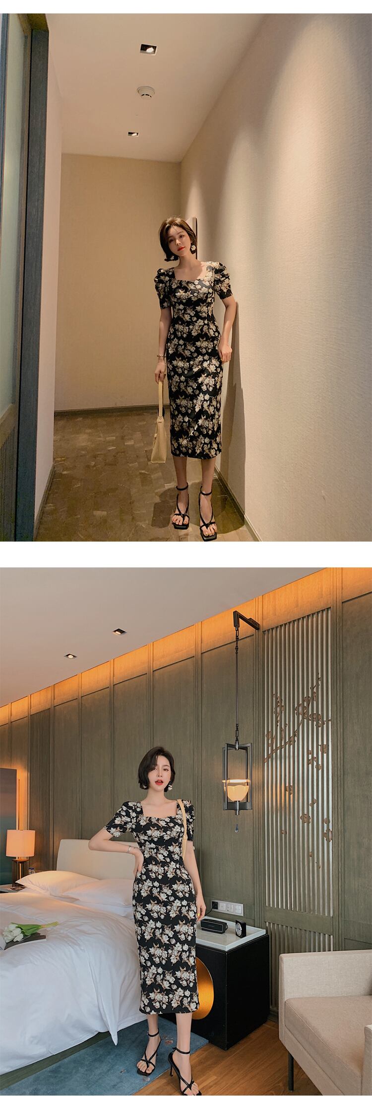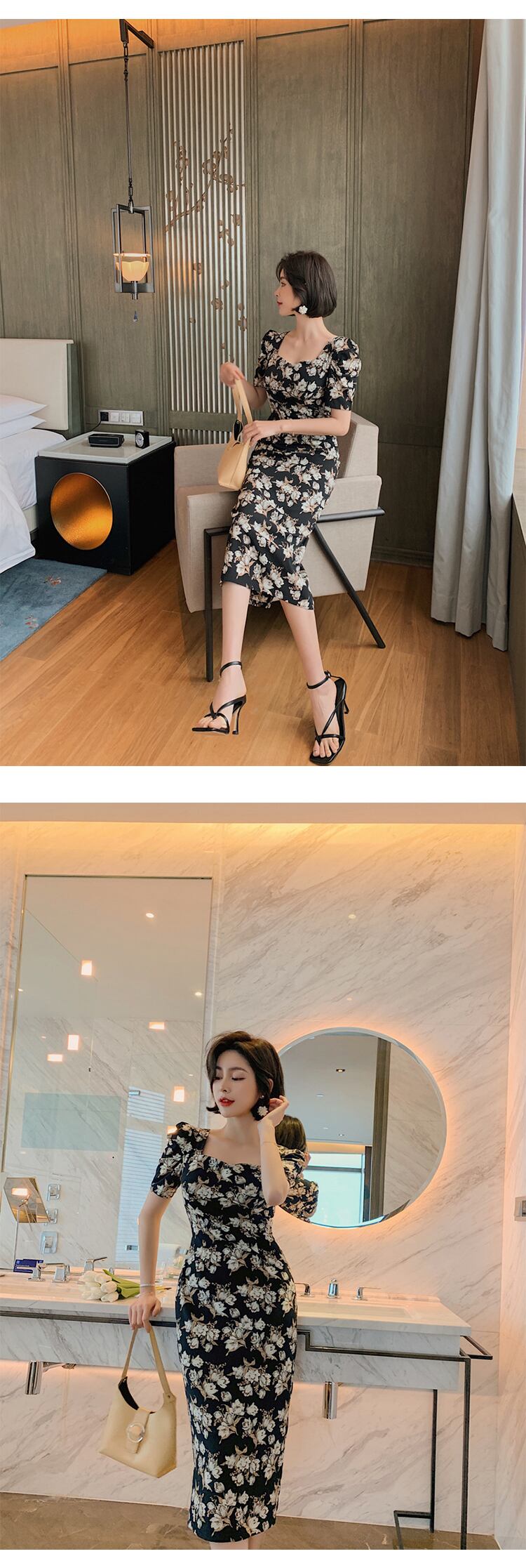 新着ファッション パーティー ペンシル ドレスエレガントな夏ヴィンテージ パフ スリーブ プリント黒気質スリム ミディ ビーチ ドレス ブラック サマー 夏物 ビンテージ