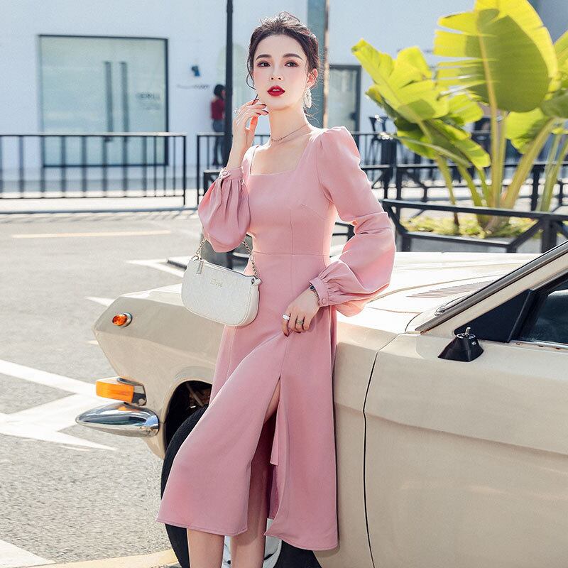 新着ファッション韓国春ミディ ドレス OL 気質シフォン スクエア ネック ランタン スリーブ甘いスプリット a ライン ドレス ランタンスリーブ 大人ガーリー スウィート キュート カジュアル スプリング 春物 Aライン スクウェア